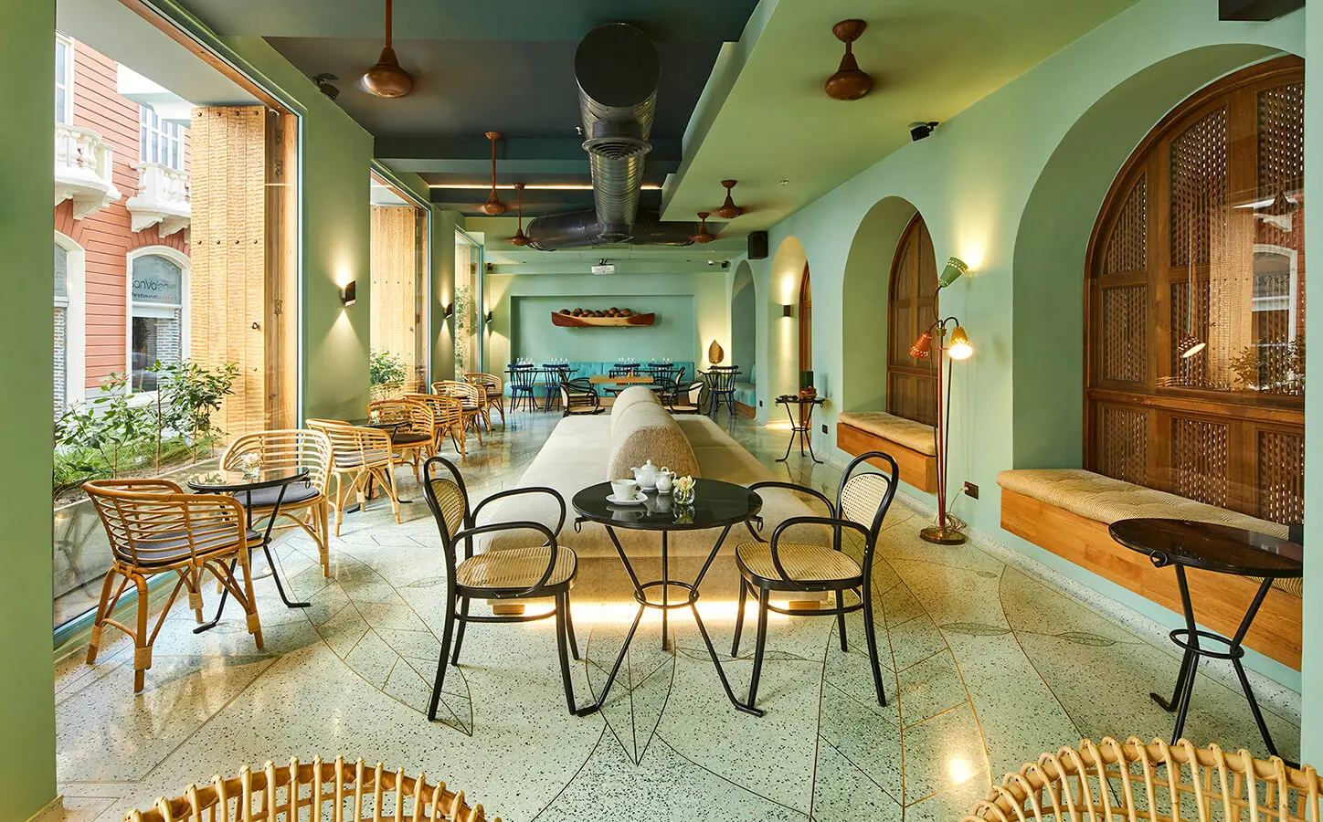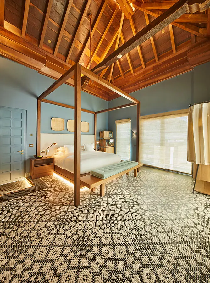 Nada de eso habría sido posible sin la mano de obra de artesanos colombianos que dedican su vida a esta tradicional labor. Durante el desarrollo del proyecto participaron miembros de comunidades indígenas y campesinas, así como el ebanista paisa Juan Carlos Franco y la diseñadora Poli Mallarino, quienes se diferencian entre sí en virtud de su formación y experiencia. Sin duda, ese antagonismo, que potenció aún más el carácter ecléctico del interiorismo, hace que el lenguaje vernáculo y el universo cosmopolita se conviertan en uno solo.