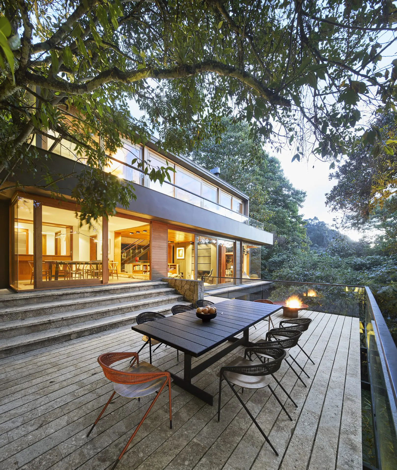 Esta vivienda, creada por los arquitectos Iván Baquerizo y Johana Sanint, está ubicada en las montañas saliendo de Bogotá, en medio de un lote boscoso sobre una topografía inclinada. La presencia de un árbol centenario y de un arroyo en la parte baja del lugar define un criterio claro para el emplazamiento de la construcción y para las estrategias del diseño.