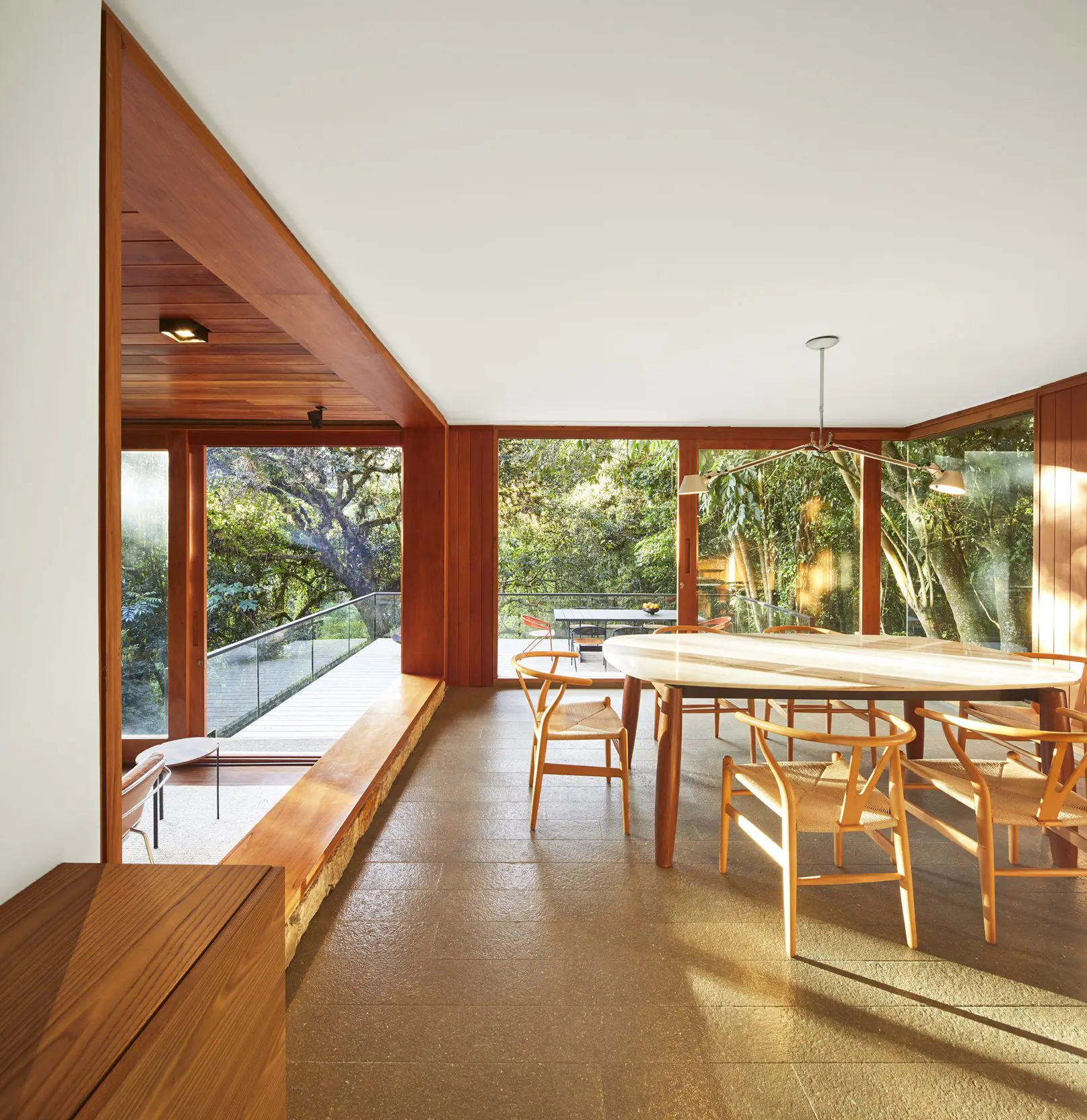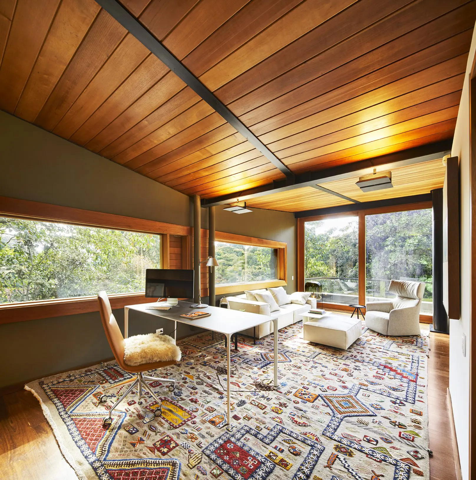 Cada uno de los tres pisos establece una relación directa con distintas zonas del bosque. El más bajo se abre al arroyo y contiene un estar de televisión, la habitación de servicio y una sala de juegos para los niños, integrada con una cocineta y un baño, que son apoyo para una alcoba de invitados. El intermedio, por donde se accede a la casa, se vincula visualmente al follaje desde el área social, donde la sala aparece como un subnivel deprimido con una altura controlada de tres metros, separada del hall de acceso por medio de un mueble que sirve de biblioteca.
