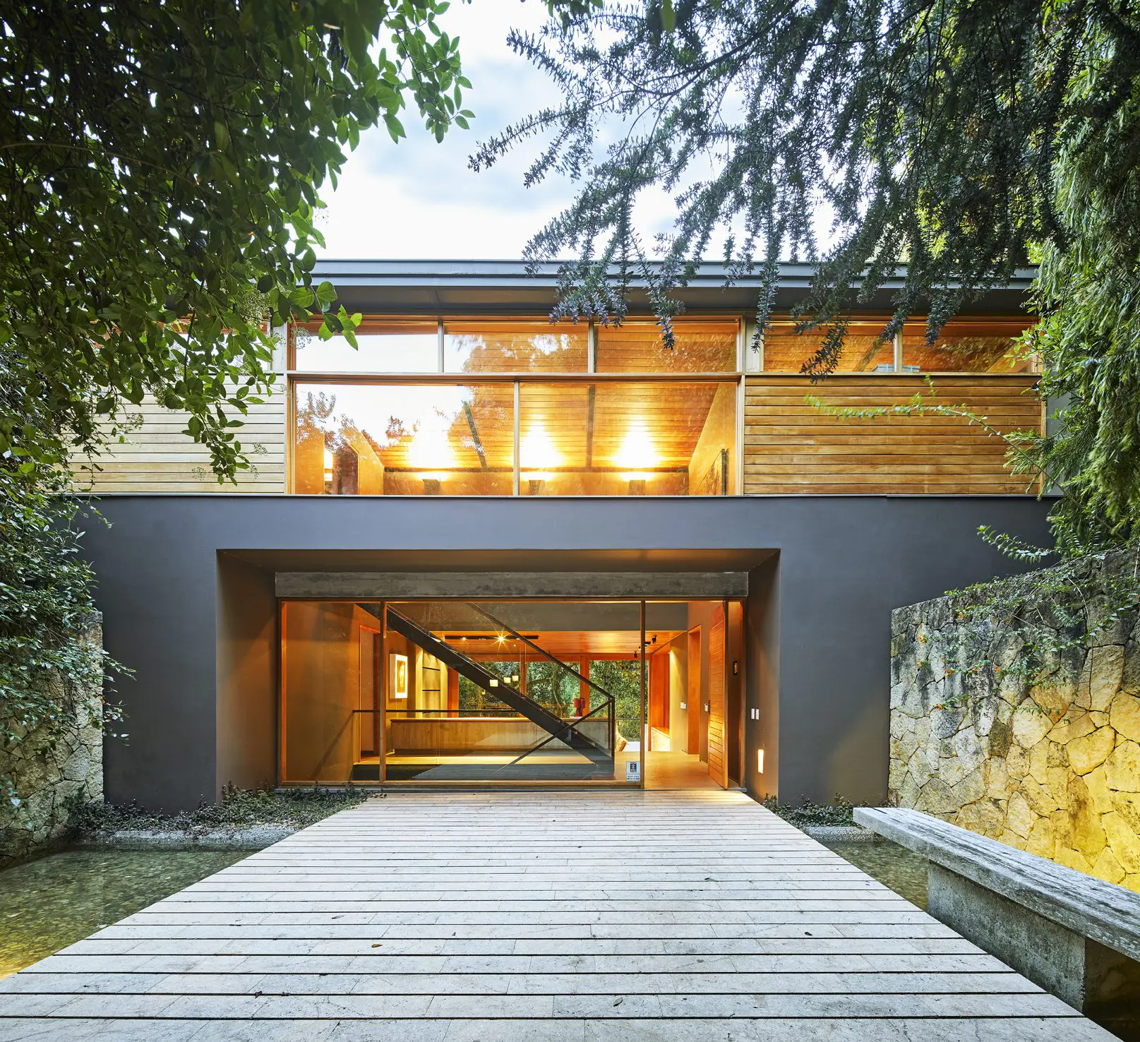 Una de las ideas rectoras del proyecto fue su crecimiento en el tiempo. Inicialmente, concibieron la casa como un pabellón para una pareja, luego la ampliaron con el fin de tener espacio para un hijo; finalmente, en una tercera etapa, la consolidaron como una vivienda para cuatro personas. Asimismo, con el objetivo de promover la reunión y el encuentro familiar, los ambientes se concentran y se recogen en lugar de extenderse sobre el terreno, como suele hacerse en este tipo de contextos. Esto, a su vez, refuerza el sentido de refugio, un escape a la vida urbana en torno a un viejo árbol.