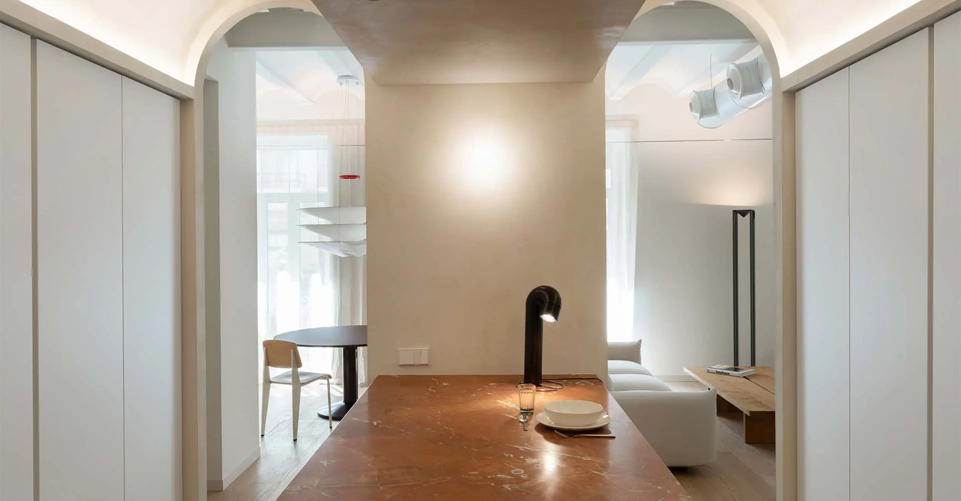Cada bóveda asume un papel específico dentro de esta secuencia. La primera, más contenida, crea un nicho independiente que alberga un espacio de trabajo y una biblioteca. La segunda se extiende a lo largo de toda la cocina, definiendo su zona más funcional y convirtiéndola en el verdadero escenario de la vida doméstica. La tercera se extiende hacia la zona de noche y, si bien sigue formando parte del espacio central, actúa como eje de distribución, concentrando el acceso a los dormitorios.