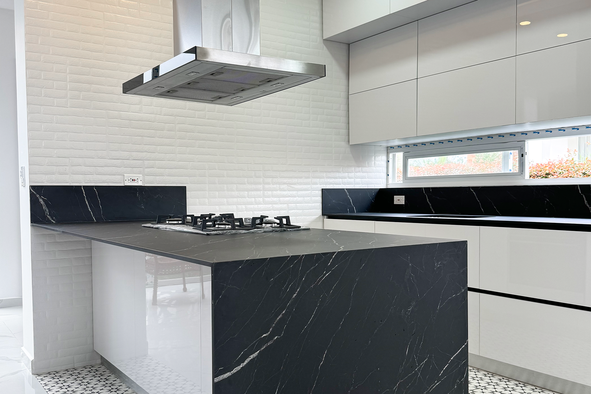 Blanco y negro: estos son los colores base para la propuesta de interiorismo de una cocina diferente, ubicada en un proyecto residencial en Pitalito (Huila). La península de este ambiente —que también funciona como barra— es una de las áreas de trabajo principales, por lo que para su diseño contaron con el apoyo de CompactSlab, de la compañía Lamitech.