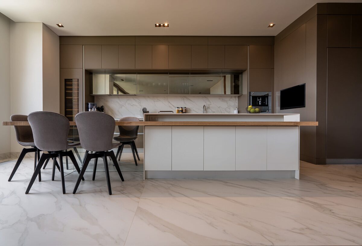 En esta cocina italiana, de referencia Charme 37, “los materiales se combinan sutilmente para dar continuidad desde el salpicadero hasta la isla central, compuesta por una mesa de madera natural que se usa como comedor auxiliar, y un módulo de servicio que se mezcla con los mesones y pisos sinterizados en grandes formatos, convertidos visualmente en un solo bloque”.