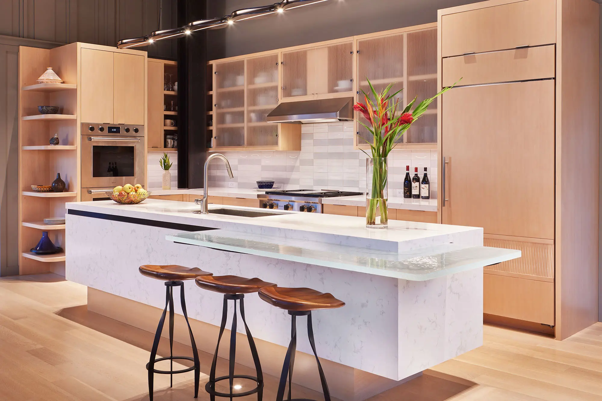 La isla es la indiscutible protagonista en esta cocina. Su generoso tamaño le permite tener diversas áreas de trabajo y una barra para acomodar múltiples comensales. Compañías como La Cuisine Appliances entran en escena.