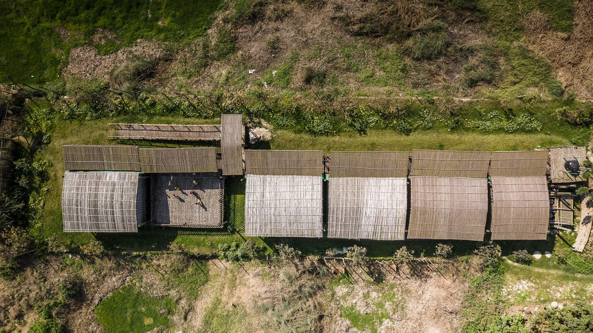 El arquitecto usó módulos anfibios hechos en bambú de la zona que contrarrestan el mal clima del año. La obra consta de una estructura lineal de 8 volúmenes rectangulares independientes y se usaron más de 30 tambores de acero reciclados y algunos neumáticos viejos de automóviles que permiten darle piso a la estructura y que pueda flotar o que funcione por medio de una especie de anclaje.