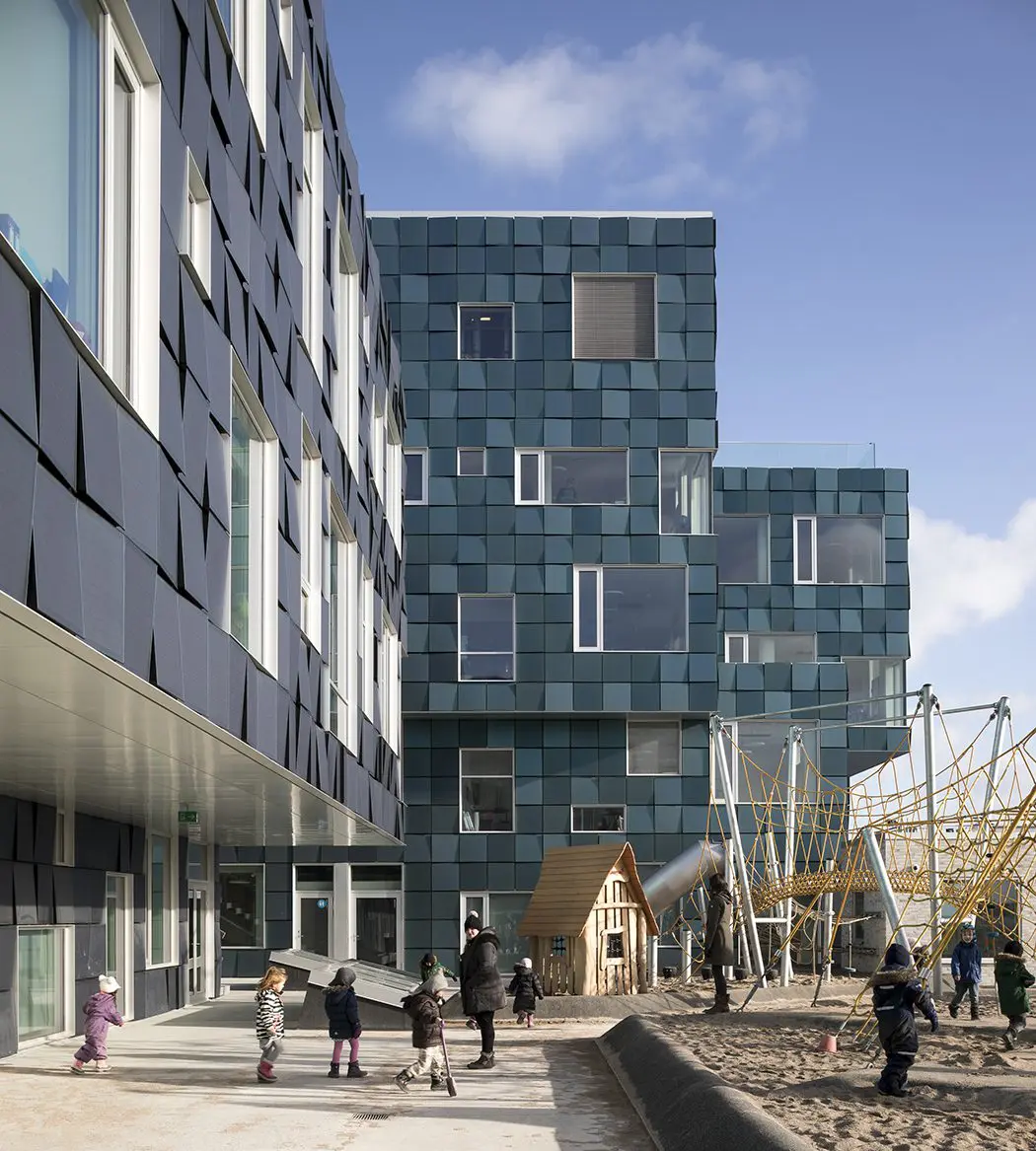 La fachada única del edificio escolar estará cubierta por 12,000 paneles solares, cada uno en ángulo individual para crear un efecto de lentejuelas, que suministrará más de la mitad del consumo anual de electricidad de la escuela. Las células solares cubrirán un área total de 6.048 metros cuadrados, lo que la convierte en una de las plantas de energía solar integradas en edificios más grandes de Dinamarca, que se estima que produce más de 200 MWh por año.