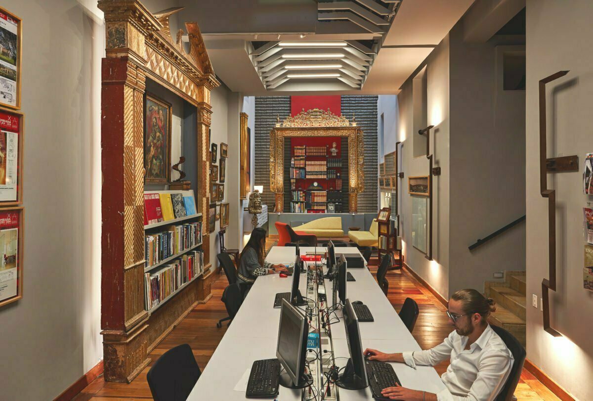 pero que al encontrarlos y recuperarlos del olvido los reinterpreta y logra que cumplan un papel utilitario. Un ejemplo de esto son los dos portales dorados y coloniales que protagonizan su taller, que solía ser un anticuario y que él, junto con su equipo, remodelaron por completo. Se enorgullece de haberlos rescatado de las ruinas para darles nuevos usos desde lo que él considera su versión de la arquitectura contemporánea.
