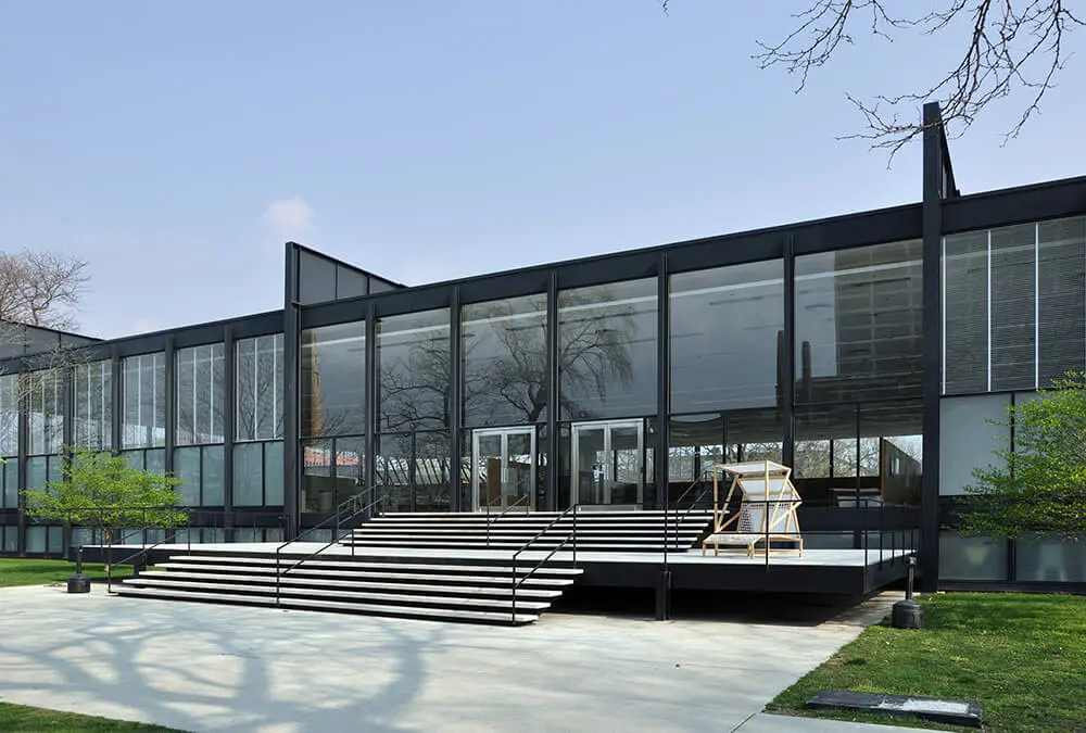 En el Crown Hall el uso de fachadas completamente acristaladas y una estructura de acero llevada al exterior producen una nave flexible e integrada al paisaje.