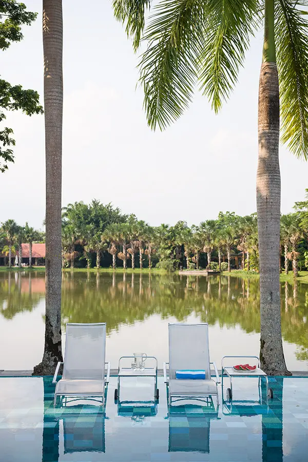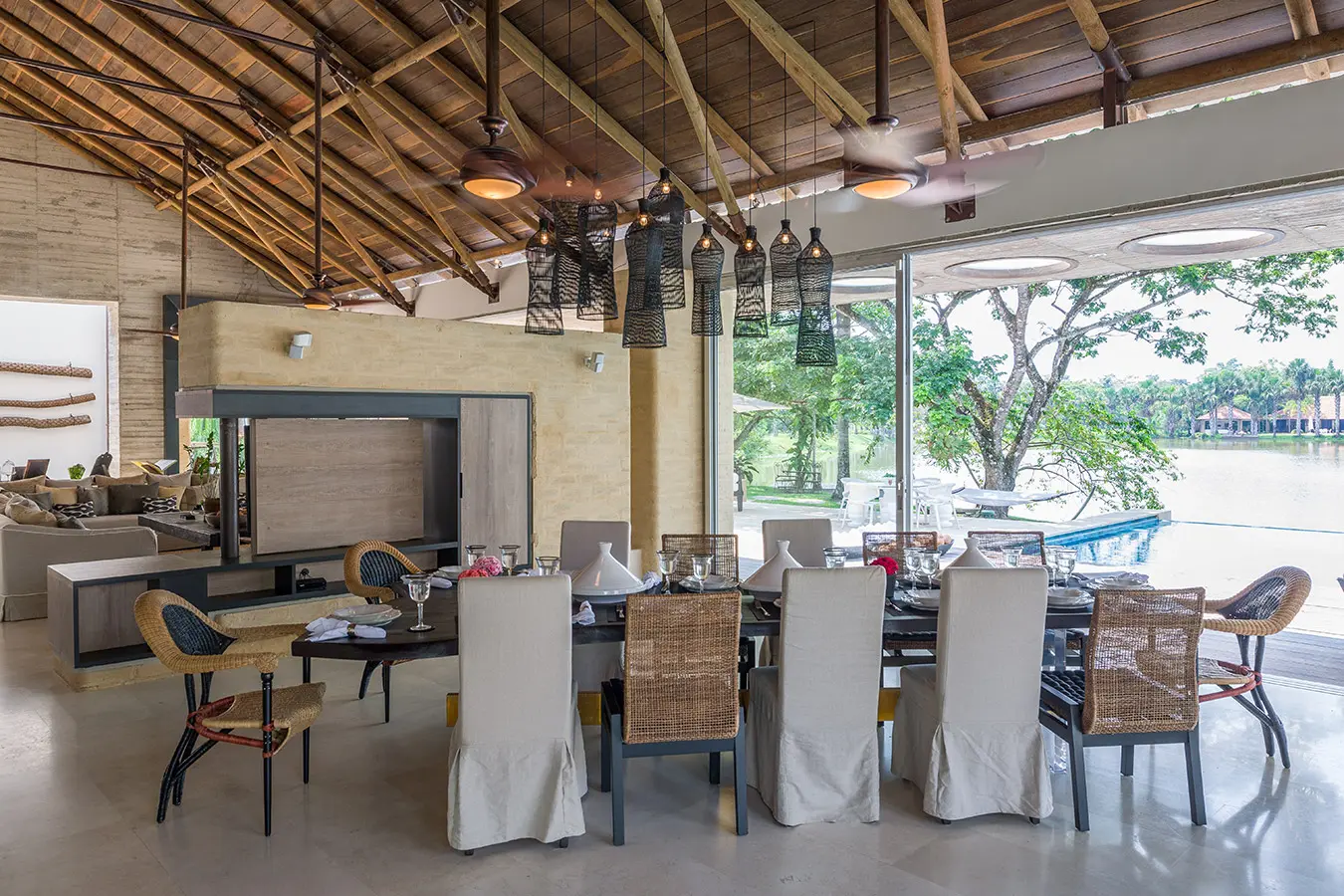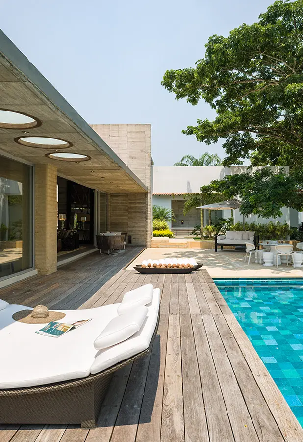 El toque tradicional de un quiosco con cubierta de palma complementa el espacio de la zona social con un sitio que permite disfrutar el paisaje y la actividad de la piscina a la sombra con relajada informalidad.
