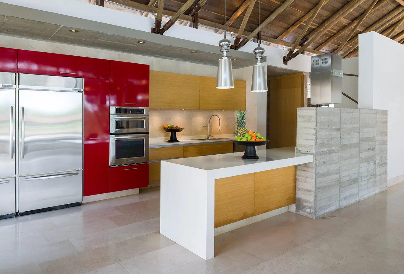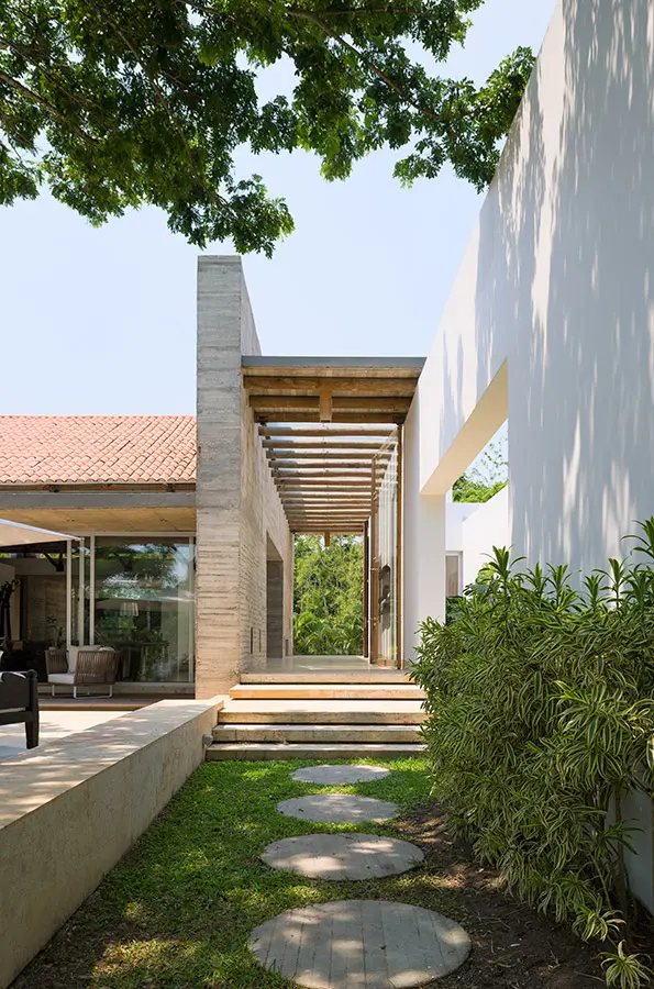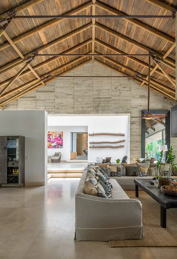En medio del muro de concreto, un imponente umbral marca el acceso a la zona social bajo una cubierta que deja a la vista su estructura de varas de teca con un alistado de tablones de sapán, sobre un piso de mármol Royal veta en losas de gran formato. Las cubiertas inclinadas, terminadas en teja española, alternan con tramos planos de concreto que crean nichos y aleros que le dan variedad al diseño interior.