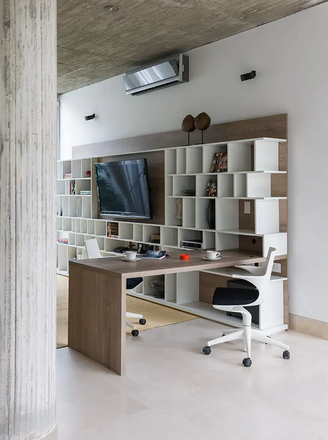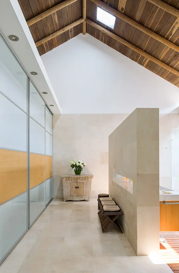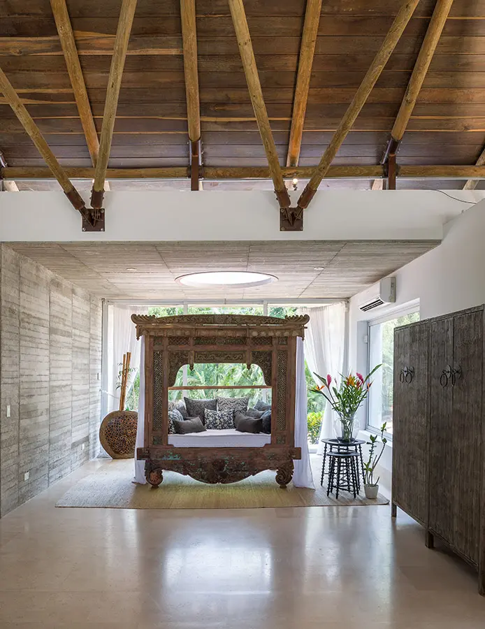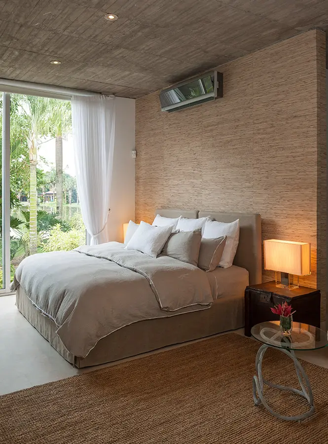 Paralela al muro de concreto, una pared blanca señala la entrada al ala privada, que tiene su punto de encuentro en el estar familiar bajo una cubierta plana de concreto a la vista que funciona como ambiente múltiple, donde es posible ver televisión, estudiar o divertirse con juegos de salón. Una gama de tonos naturales en la que predominan el mármol, la madera y el concreto, complementados con superficies blancas y lencería de lino, viste las alcobas –las de huéspedes con cubierta de concreto a la vista y la principal con una de madera que permite disponer de doble altura–.