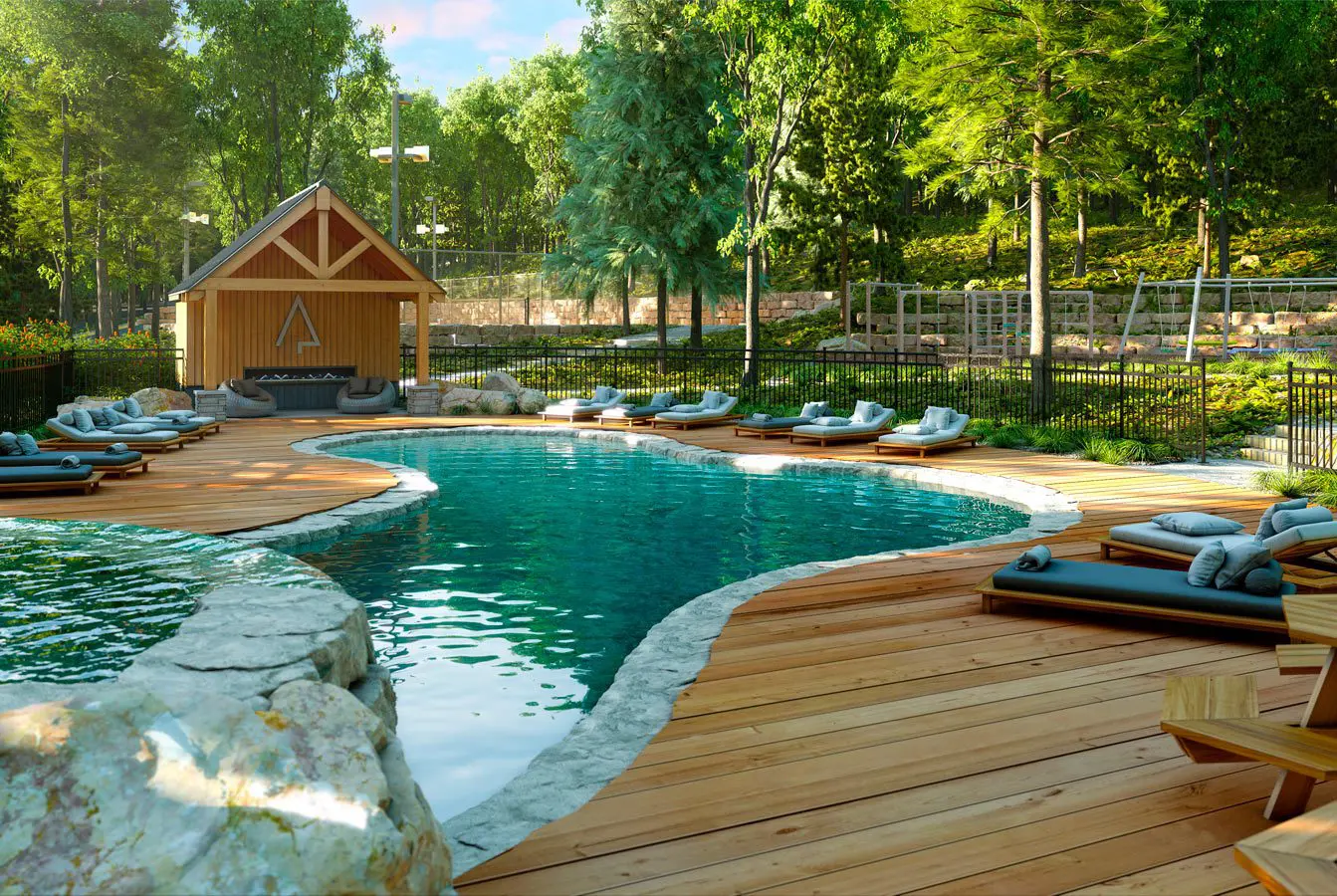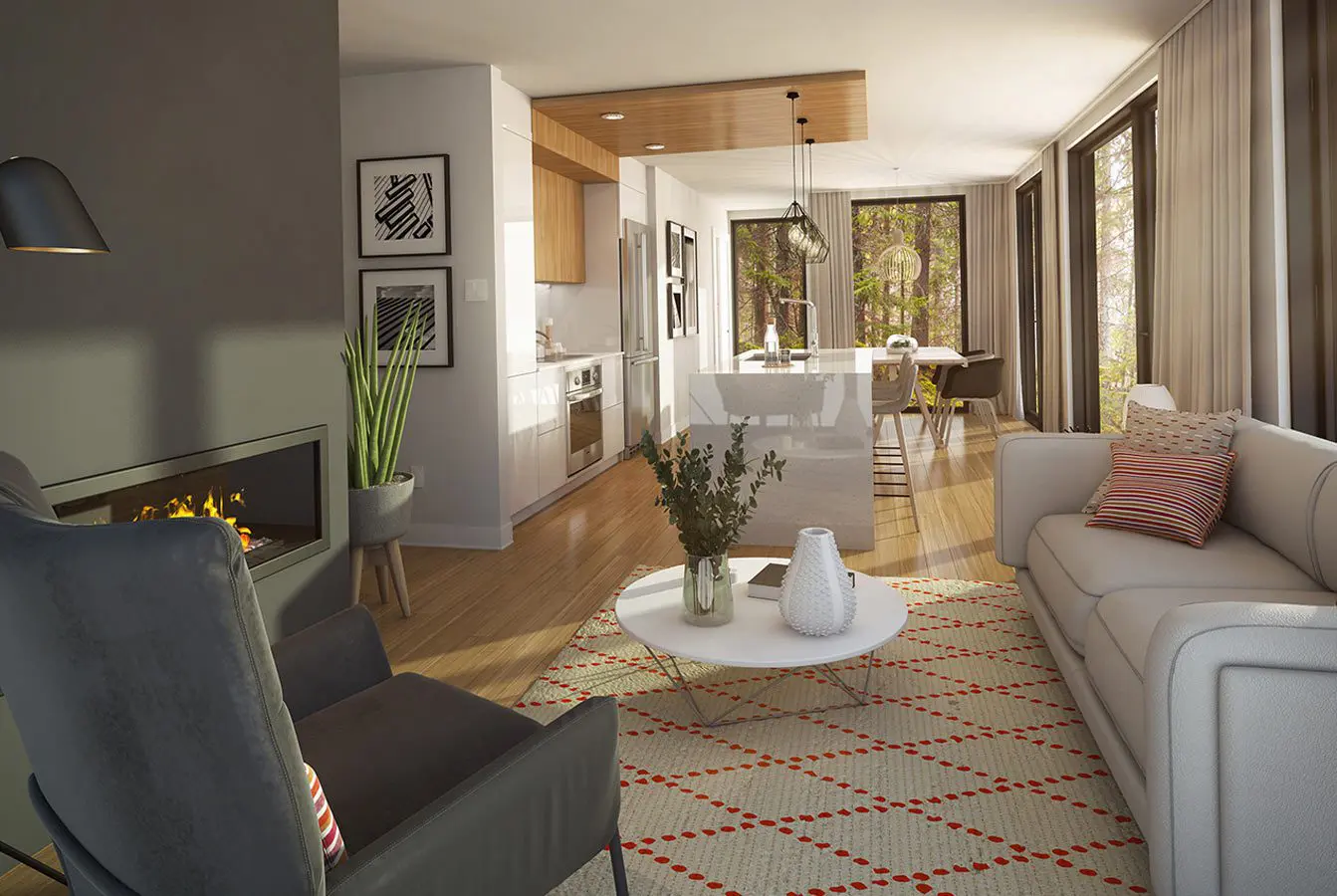 Cada unidad será edificada con materiales naturales y contará con una chimenea de gas, techos de 9 a 15 pies, insonorización superior y amplias ventanas para enfocar la naturaleza. Además, ofrecerá servicios completos, que incluyen una piscina climatizada al aire libre, bañera de hidromasaje, estanque con muelle, canchas de tenis y voleibol de playa y una chimenea al aire libre.