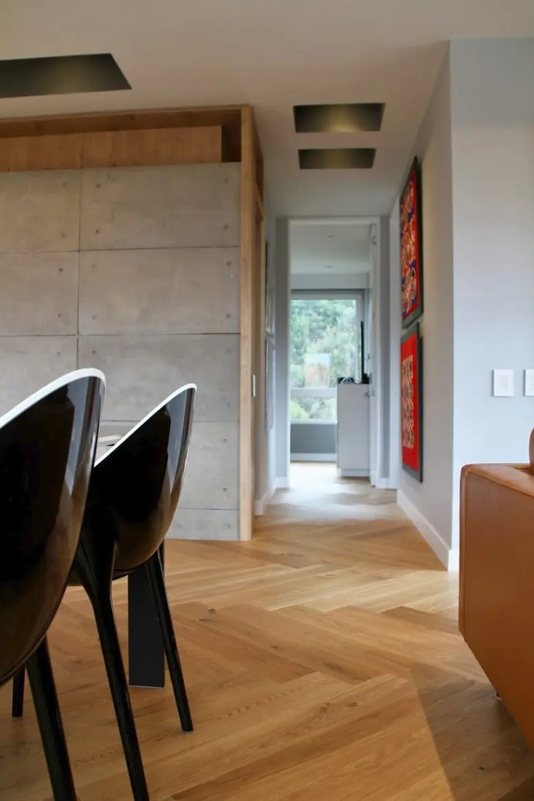 Los pisos utilizados para este proyecto residencial tienen una estructura multicapa que los hace más estables frente a los cambios de temperatura –no van a deformarse–. Además, su lacado mate de siete niveles aumenta la resistencia a los rayones y hace que su limpieza sea bastante sencilla. Incluso, se pueden instalar en áreas como la cocina. Producidos en Europa con estrictos procesos medioambientales, estos pisos otorgan puntos para certificaciones sostenibles como la LEED. Para finalizar, un consejo: en una obra es ideal que este producto sea lo último en instalarse para evitar accidentes que afecten la madera.
