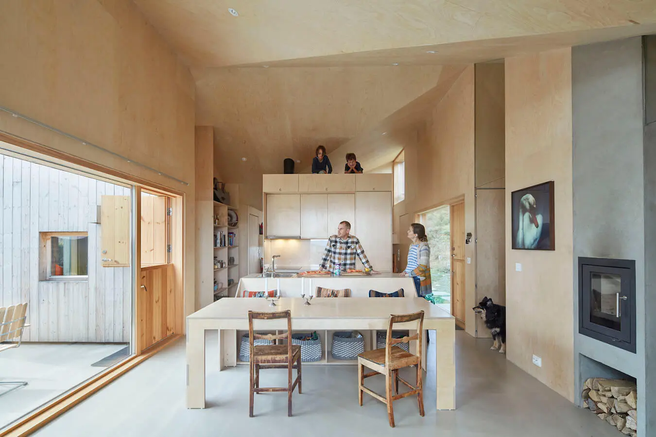 Muebles de madera contrachapada personalizados, incluyendo marcos de cama, literas, sofá, mesa de comedor, bancos y estantes se encuentran en todo.«Queríamos crear un sitio limpio y simple así que usé solo dos materiales para el interior: contrachapado de pino y hormigón «, comenta Lexie Mork-Ulnes. Las paredes, el techo y todos los muebles son de madera contrachapada con bordes expuestos, y los pisos,encimeras, y las paredes del baño son de hormigón. Los muebles diseñados a medida paraesta cabina crea un ambiente acogedor para la familia y sus invitados, añadiendotoques de bosque con fieltro verde de lana de Kvadrat para los tapizados empotrados.