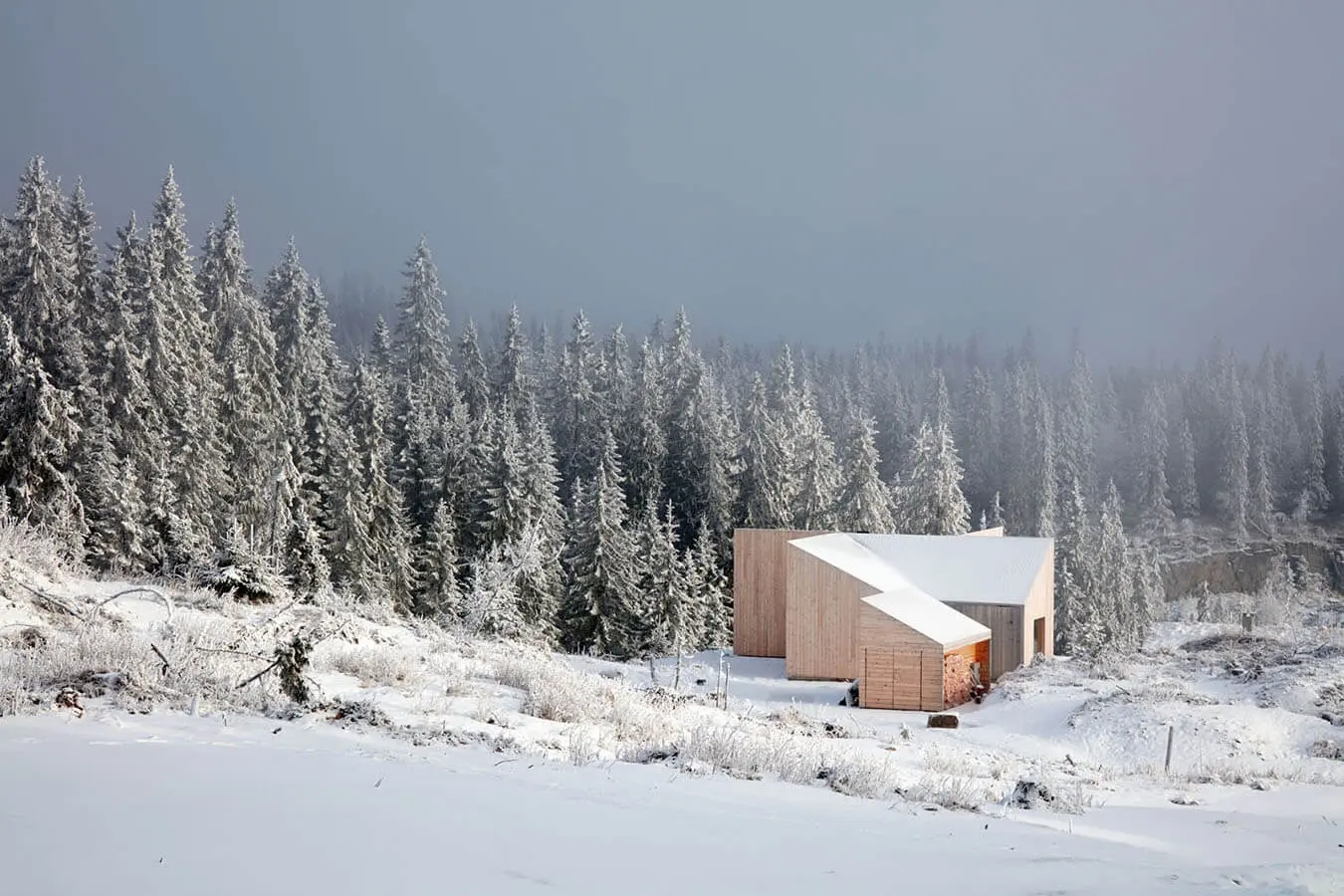 El desafío del diseño era volver a trabajar el tipo de construcción hytte tradicional manteniendosu carácter utilitario -compacto, eficiente e impulsado por la función- pero pensando el diseño en relación con el paisaje y crear un interior más expansivo y generoso, y aun así incluir tres dormitorios y dos baños completosen 84 metros cuadrados. Aunque las regulaciones de planificación requerían un techo a dos aguas, los arquitectos pudieron dividirse el frontón a la mitad para crear cuatro techos de cobertizo. Esto produjo un plan de pinwheel con dosespacios al aire libre protegidos – el porche de la mañana y el porche de la tarde – quecaptura el sol y está protegido del viento y la nieve del techo.