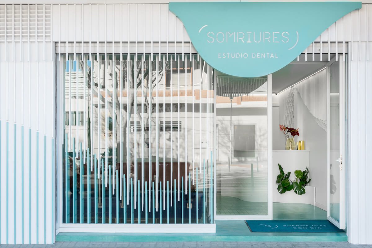 Los clientes siguieron el trabajo de la consultora de diseño a través de las redes sociales y decidieron contactarlos para realizar la renovación de su clínica dental Somriures, que se encuentra en un pequeño pueblo llamado L’Alcudia, a unos 30 km de distancia de Valencia, España. La especialidad de Somriures es el diseño de sonrisa, el diseño de la clínica dental se basa en este concepto y través de una escultura de 2884 tiras de tiras de madera que cuelgan del techo y algunas paredes principales, recrea una sonrisa. La escultura de arriba es la guía perfecta para llevar a los clientes de un punto a otro.
