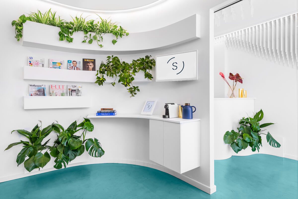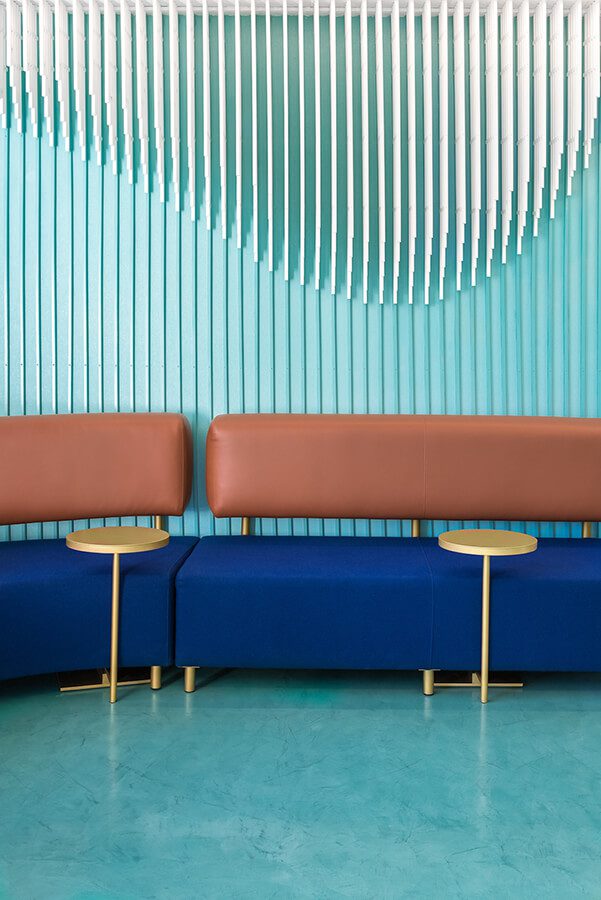 Por otro lado, la combinación de color turquesa verde y blanco genera una sensación suave, mientras que los pequeños toques de oro, cuero marrón y azul oscuro establecen un contraste sofisticado. Además de los muebles hechos a medida, se usaron formas orgánicas para combinar perfectamente con el concepto de una hermosa sonrisa. «Ha sido una experiencia interesante crear el nuevo espacio de Somriures. No fue un proyecto habitual para nosotros en el que pudimos agregar muchos pequeños detalles decorativos. Totalmente contrario a esto debido al tipo de negocio que necesitábamos para diseñar un diseño global serio y sofisticado a través del uso mínimo de materiales”. Agregan Hernández y Penasse.