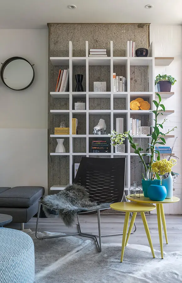 Un muro de pizarra, que contrasta con el de concreto visto de la biblioteca, permite a su propietaria realizar diversos dibujos e incluso anotar recetas de cocina –una de sus grandes aficiones–. Detrás de este elemento lúdico está oculto un clóset para almacenar todos los implementos de aseo y el lugar para colgar la ropa, así son imperceptibles para los visitantes. Este tipo de estrategias demuestran una propuesta de interiorismo que no requiere metros cuadrados ilimitados para lograr un hogar cálido, donde todo está integrado sin perder su esencia.
