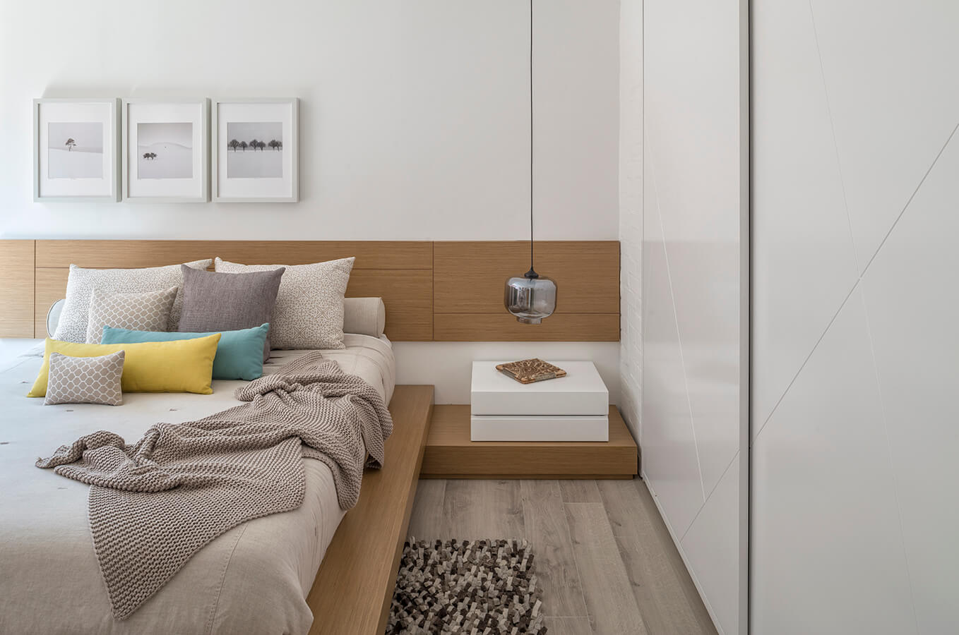 Entre las principales transformaciones está la cocina. Ahora el mesón de trabajo –que también puede usarse como barra– se convierte en su parte final en una banca para el comedor, así estos ambientes se integran con la zona social sin desaprovechar el espacio. Aquí, como en todo el apartamento, el blanco y colores afines son utilizados para dar la sensación de amplitud y mejorar la iluminación. Sobresale el acabado wash en el muro de ladrillo.