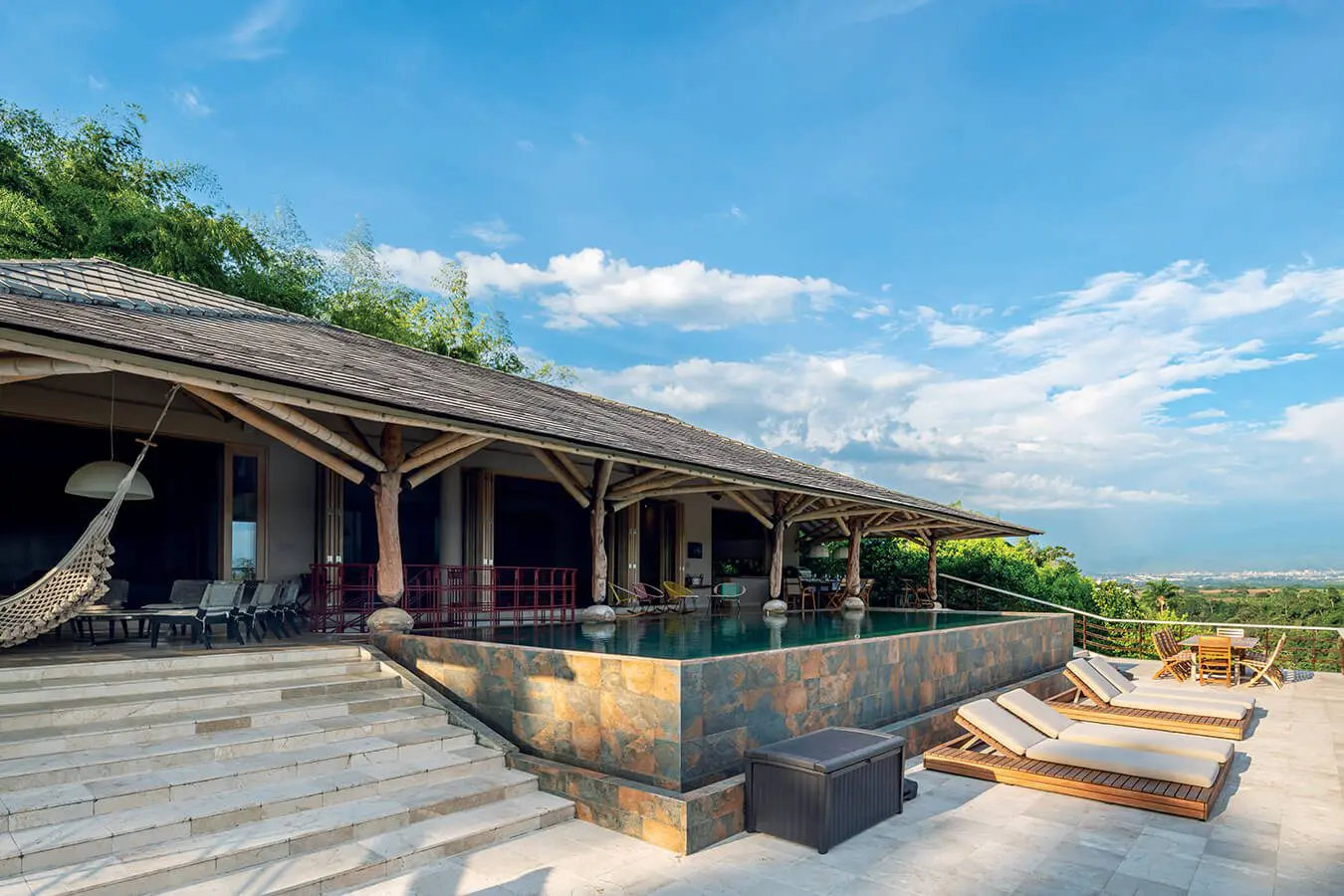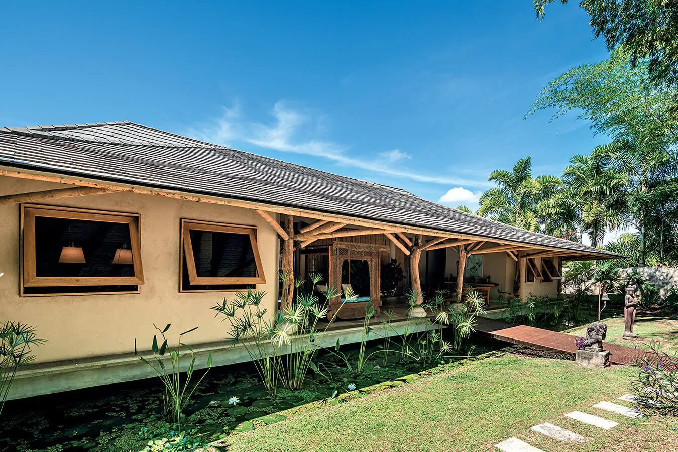 El muro exterior es muy cerrado, y mantiene la privacidad al interior del lote”, afirman sus habitantes. Pero una vez se cruza la puerta, la vivienda es completamente abierta, integrada con las visuales lejanas y fundida con la exuberante naturaleza que la envuelve.