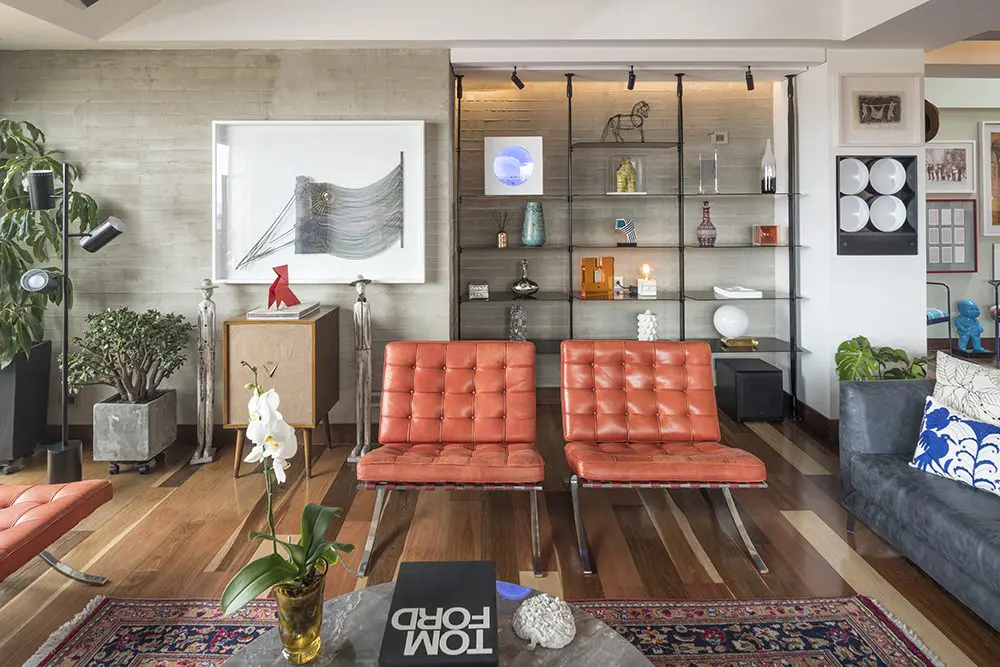 sentido de sus creaciones. El mobiliario mantiene un equilibrio entre diseño y confort, y establece un diálogo visible con la identidad de la vivienda, caracterizada por la presencia de arte. En la sala, el naranja intenso de las sillas Barcelona –autoría del arquitecto y diseñador industrial germano- estadounidense Mies van der Rohe– contrasta con el azul medianoche del sofá y salpican de color la zona social, al tiempo que la hacen aún más acogedora.