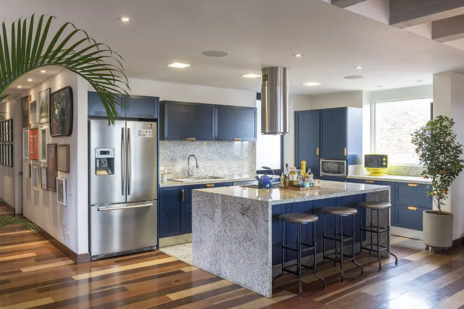 La sala no es el único espacio donde los acentos de color irradian energía y belleza, pues a lo largo del apartamento una gran variedad de formas, texturas y tonos –presentes tanto en las obras de arte como en los muebles–, hacen de los ambientes algo realmente especial. La cocina es un espacio singular. En ella se perciben elementos poco usuales, como la carpintería de madera natural, con tratamiento a poro abierto y pintada de azul.