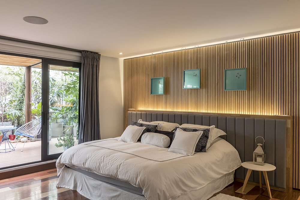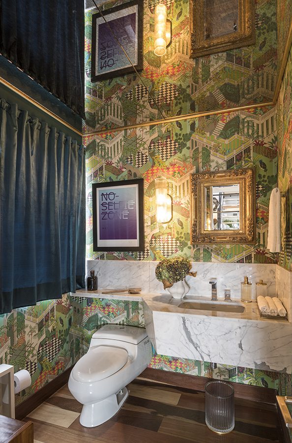 El baño social ofrece una experiencia espacial, en la que otra serie de objetos decorativos, como las cortinas de terciopelo y el papel tapiz con estampados en colores ácidos crean una atmósfera divergente y llena de vida. Entre tanto, los listones de madera natural, que se encuentran en la cabecera de la cama de la habitación principal, replican un entramado de luces y sombras que aportan calidez y visos de sofisticación al ambiente. Proyectos como este invitan a pensar en la indispensable relación entre el arte y aquellos lugares que forman parte de nuestra identidad, como la casa. En este punto, el resultado es una auténtica querencia por los espacios cuya alma y corazón son las obras.
