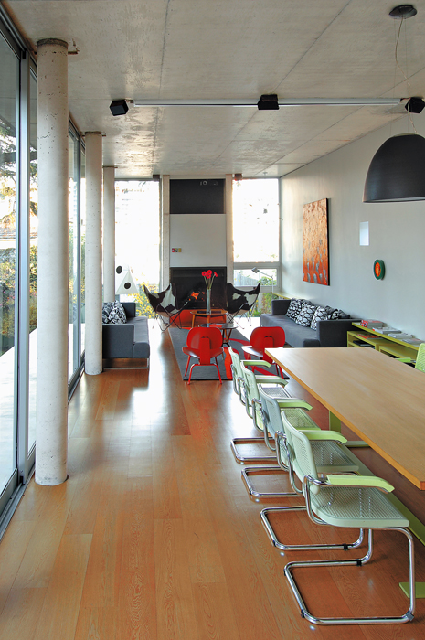 La nota más cálida la confiere la madera de los pisos del salón-comedor, el deck, y unos detalles en los baños. En cuanto a la decoración, la pareja realizó una selección de objetos en coherencia con el espíritu de la obra, con fuerte presencia del diseño moderno y contemporáneo (desde Breuer hasta Noguchi) se combinan con obras de arte contemporáneas y otros detalles personales que otorgan la autenticidad y personalidad única a ese hogar. La paleta de color alegre equilibra la sobriedad de las formas y el punto perfecto entre comodidad y estilo se refleja en cada rincón.
