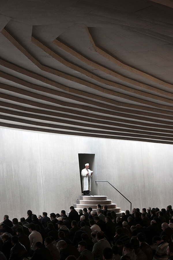 La única señal del edificio en el panorama circundante es el minarete –torre de las mezquitas musulmanas–, construido en la cima de una colina, mientras el espacio de oración está escondido en la ladera, detrás de la forma natural del paisaje. Así evitó el arquitecto las limitaciones culturales y las discusiones sobre la forma. Los materiales utilizados en la construcción –en especial las lajas de piedra que recubren el exterior– contribuyen a la fusión con el entorno.