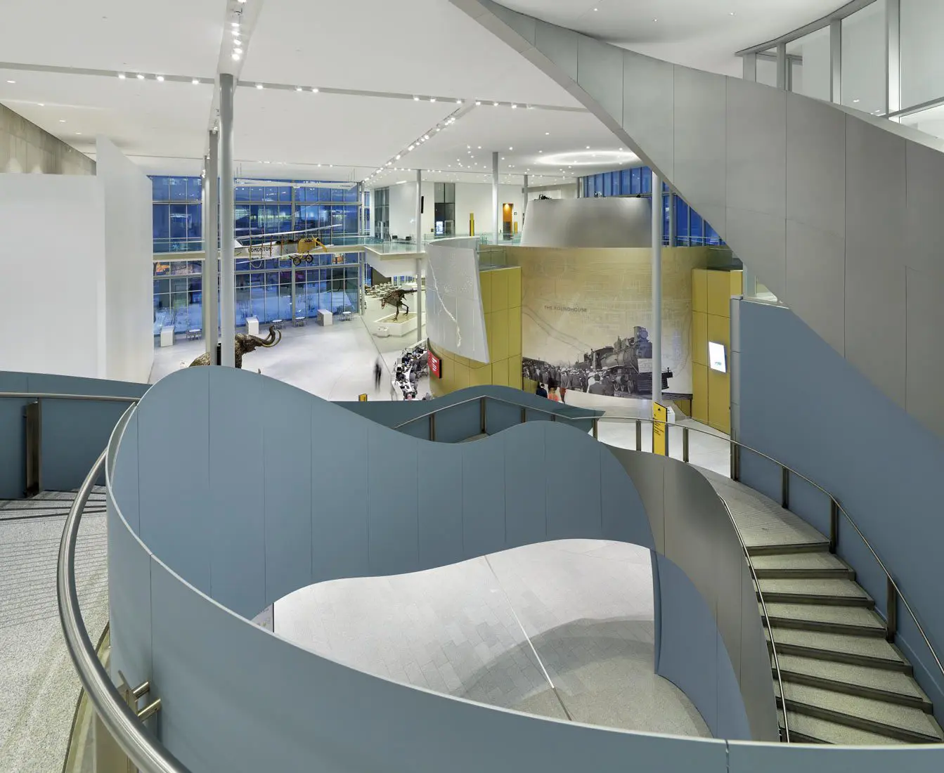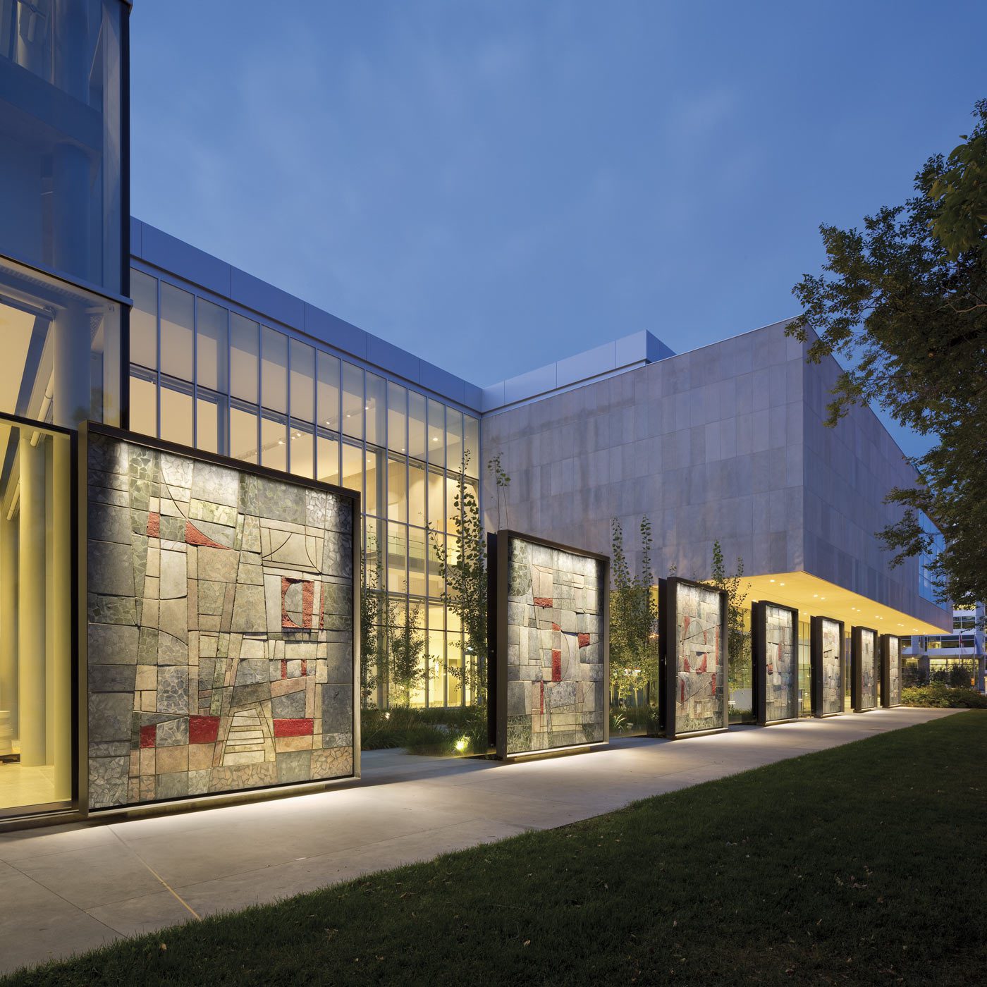 Las columnas alrededor de las paredes exteriores se convierten en los troncos de los árboles. Se extrae un dosel de hojas de álamo temblón y se corta con láser en paneles metálicos que envuelven la superficie exterior y arrojan luz moteada al espacio. En el vestíbulo, una enorme escalera escultórica que imita los cañones tallados en agua en las Montañas Rocosas permite una circulación encantadora entre las galerías permanentes.