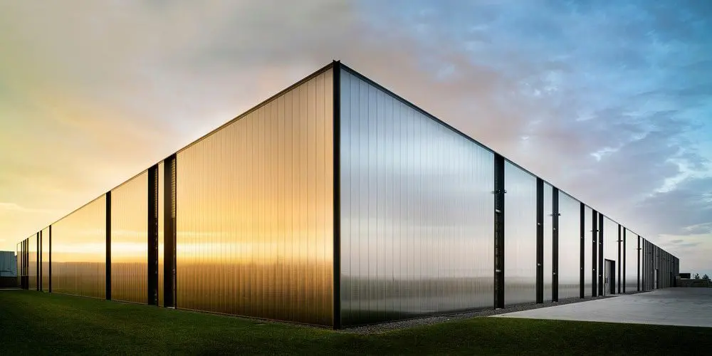 La fachada consta de un solo material, de un tamaño único: un panel de policarbonato de 4 centímetros de grosor, de unos 10 metros de altura, fijado a una estructura de hormigón prefabricado. Los paneles de policarbonato se personalizan para obtener una fachada reflectante cuando se ven desde lejos y profundos cuando se observan de cerca. Los paneles constan de dos tipos diferentes de policarbonato combinados: el lado trasero tiene un compuesto opaco que impide que la luz pase, mientras que el frente está «congelado». De esta manera, la estructura de carga está completamente oculta detrás del sistema de revestimiento y la verticalidad de la nueva fachada establece un interesante diálogo con los paneles de hormigón negro del edificio existente.