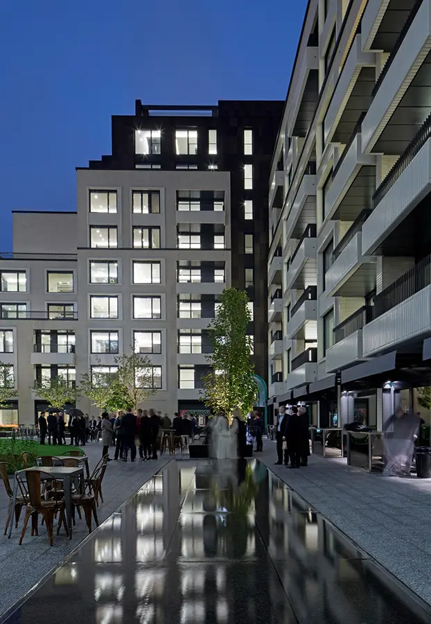 El jardín de 1.800 m2 complementa la arquitectura con una serie de espacios que incluyen una rica paleta de siembra, elementos de agua y asientos públicos. Un césped central está enmarcado por árboles semi-maduros, arbustos y plantas. El césped se eleva suavemente hacia un banco de madera curvado táctil que divide el césped de la plantación, su color oscuro que contrasta con la plantación de los alrededores y la piedra. Los edificios llegan a nueve plantas en su parte más alta en el lado norte y bajan para encajar con la arquitectura ecléctica de Fitzrovian, que mezcla estilos victorianos, georgianos y eduardianos. La fachada se ha dividido en elementos verticales para dirigirse a la calle. Del mismo modo, los usos son contextuales con los elementos comerciales en el lado sur de la parcela y los apartamentos y tiendas vinculados a las áreas residenciales en el norte. La concentración en el lado sur-oeste se escaló para atraer la luz hacia el jardín durante la tarde y la noche.