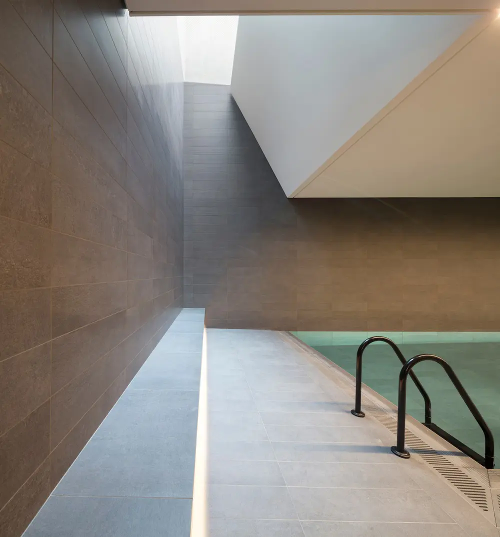Ladrillos, cerámicas y metales especializados forman la paleta de materiales, retomando los detalles de la zona. Es en gran parte monocromo, promociona líneas suaves y limpias y permite que el jardín y los pasadizos de jade verde sean la característica principal. Los elementos que dan a la calle tienen un ladrillo de cara de arcilla que tiene un tono similar, pero sin el acabado satinado de los ladrillos internos. Las proporciones de los ladrillos son más largas que la media, con juntas de mortero horizontales empotradas, mientras que la junta vertical está al ras para enfatizar la fuerte sensación de horizontalidad en los materiales. Los pisos superiores se alejan de la línea de la calle y están revestidos de aluminio anodizado bronce oscuro.