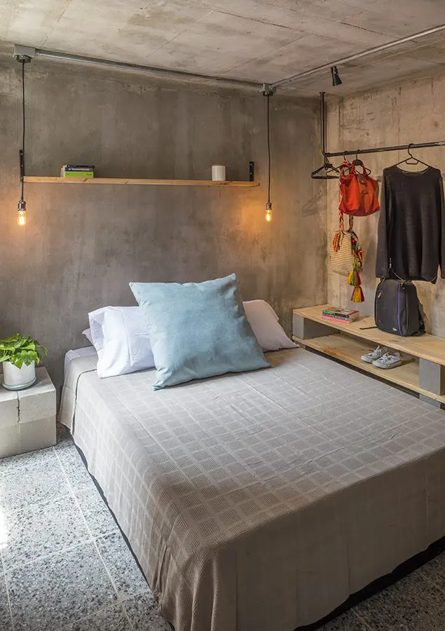 Los tres cuartos comparten una misma propuesta funcional de mobiliario: la mesa de noche está hecha con bloques de concreto, una tabla de madera sirve de repisa para poner diversos objetos decorativos, y en vez de hacer un complejo clóset crearon uno con elementos como bloques, tablas de pino y tubería de hierro. Este último diseño permite ajustarlo a las necesidades del usuario.