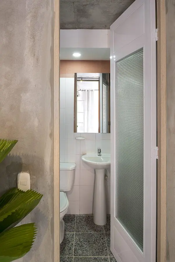 A nivel espacial no modificaron demasiado debido a que todo estaba fundido en concreto, “tratamos de enfatizar la volumetría de la arquitectura”. Esto es evidente en la cocina, donde luego de pasar el pórtico gris de la zona social, la persona se encuentra con unos muros compuestos por un zócalo enchapado –faja de la parte inferior de las paredes– y una cenefa pintada de color salmón, estrategia que se repite en el baño y en la zona de ropas. Este sencillo cambio de materiales permite que los ambientes se perciban integrados e independientes a la vez.
