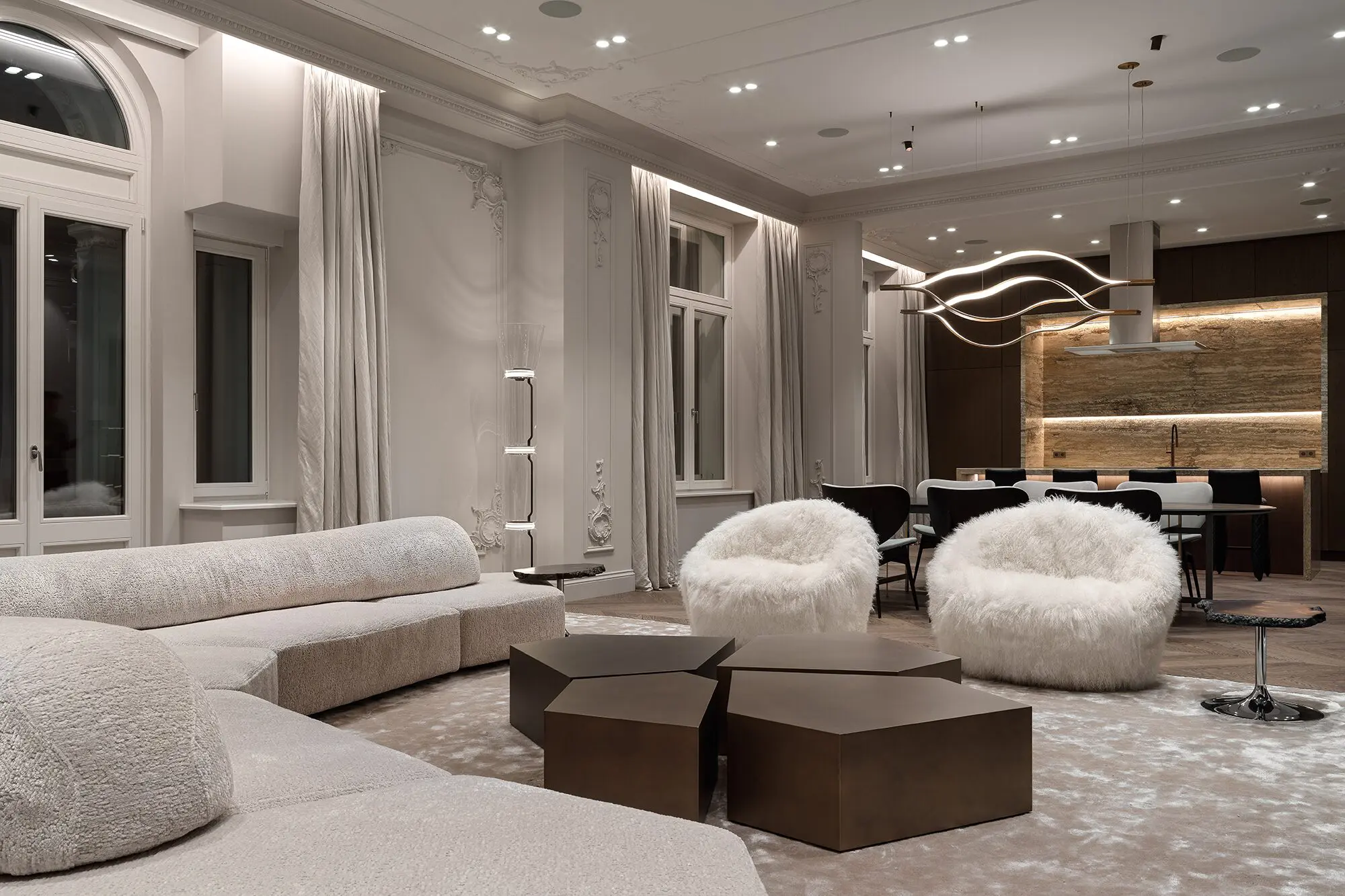 Debido al particular diseño del antiguo edificio, no había ángulos rectos en el piso. Esto obligó a revisar la geometría del espacio y a rehacer casi todas las paredes. Como consecuencia, el volumen de las obras superó los cálculos iniciales. Sin embargo, los arquitectos y diseñadores de la empresa hicieron todo lo posible para que el cliente viera su piso totalmente listo a tiempo, incluyendo la fontanería, los muebles y los objetos de arte.