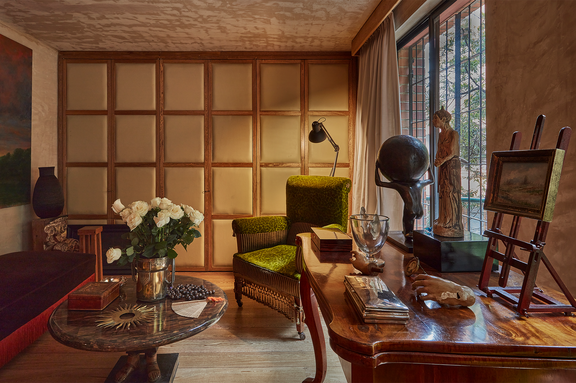 Sobre el área social, Montoya explica: “Me pareció sumamente enriquecedor reunir en un solo espacio una sala con un daybed del siglo XIX, dos elegantes poltronas victorianas en terciopelo para la lectura, un escritorio y un armario con puertas tapizadas en cuero que ocultara discretamente el televisor”.