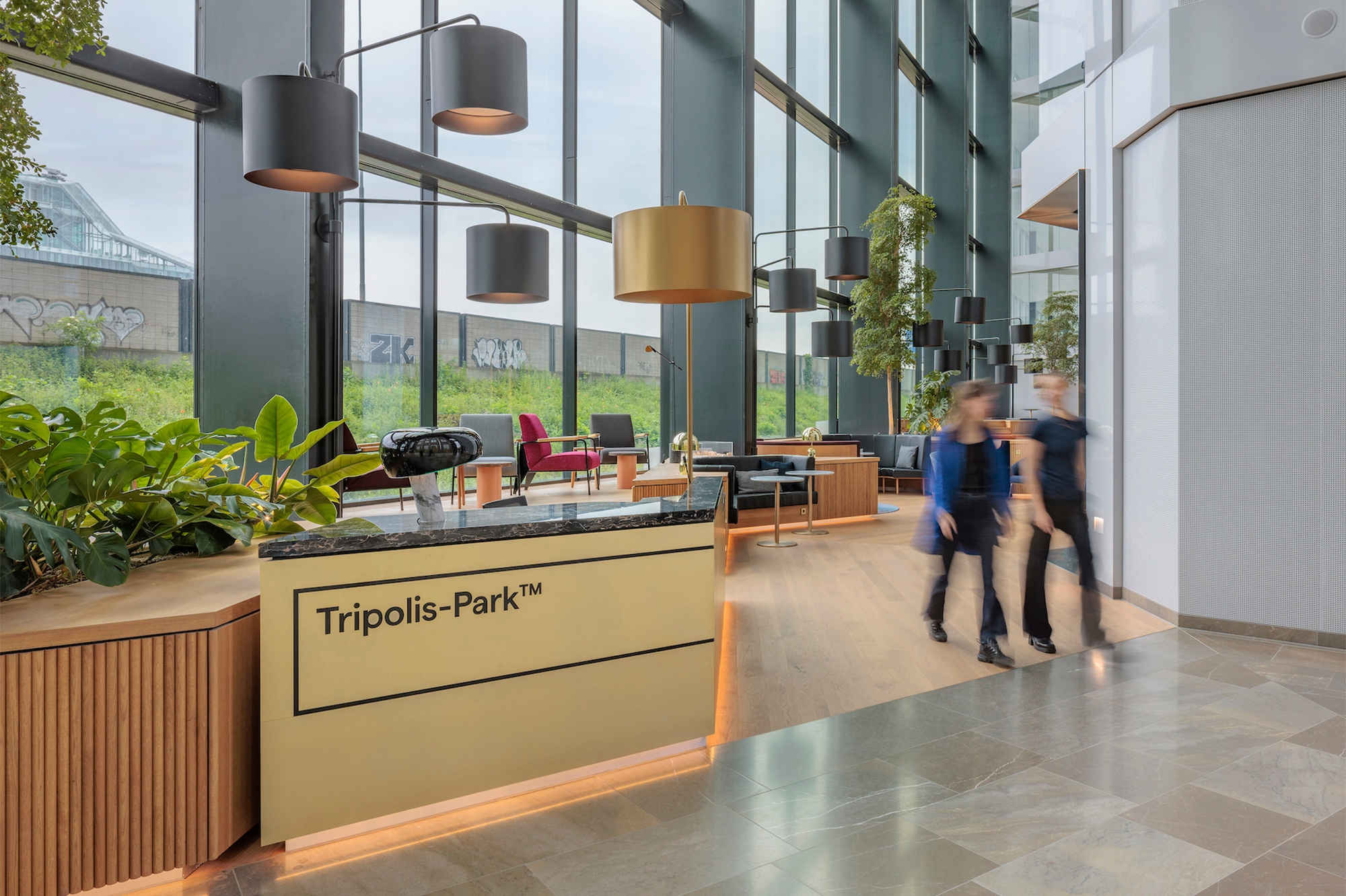El atrio cuenta con amplias fachadas de vidrio y elementos modulares, que crean una atmósfera abierta que invita a la luz natural, al tiempo que ofrece un entorno funcional para empleados e invitados. Este diseño rinde homenaje a los elementos arquitectónicos del complejo original Tripolis, mezclando la estética urbana y natural para crear una atmósfera única y vibrante.