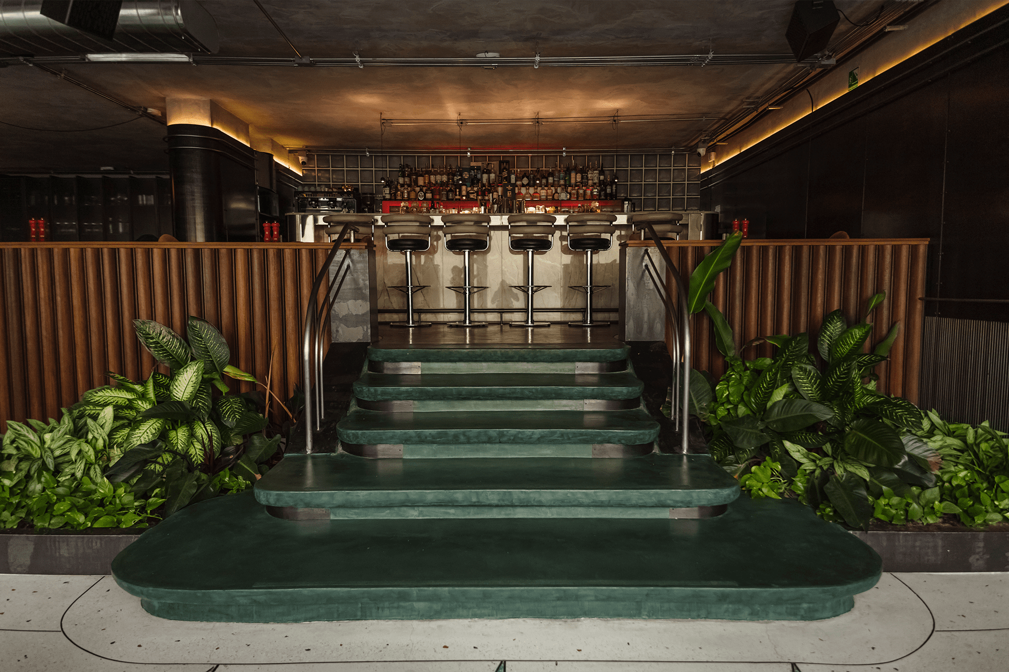 “Buscamos honrar la memoria del jazz por medio del programa —que incluye barra, cocina, escenario, un espacio suficiente para los visitantes y varios servicios complementarios—, así como mediante una estética dieselpunk —un género narrativo influenciado por el art déco, el jazz, la ficción pulp, el expresionismo alemán y el cine noir—”, explica el arquitecto Ernesto Lafaurie, cofundador de Colette Studio.