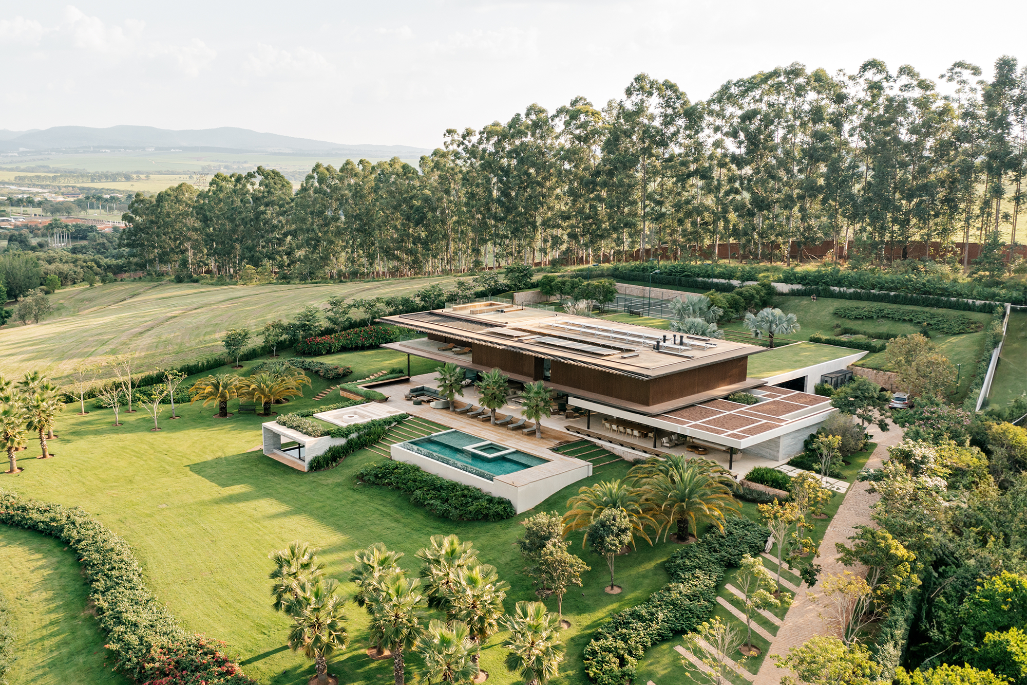 En la construcción de la residencia se optó deliberadamente por utilizar materiales autóctonos brasileños, como la madera y la piedra. Estos materiales no solo se integran armoniosamente en el contexto natural y cultural del país, sino que también ofrecen beneficios prácticos como durabilidad, resistencia y una estética sofisticada y acogedora.