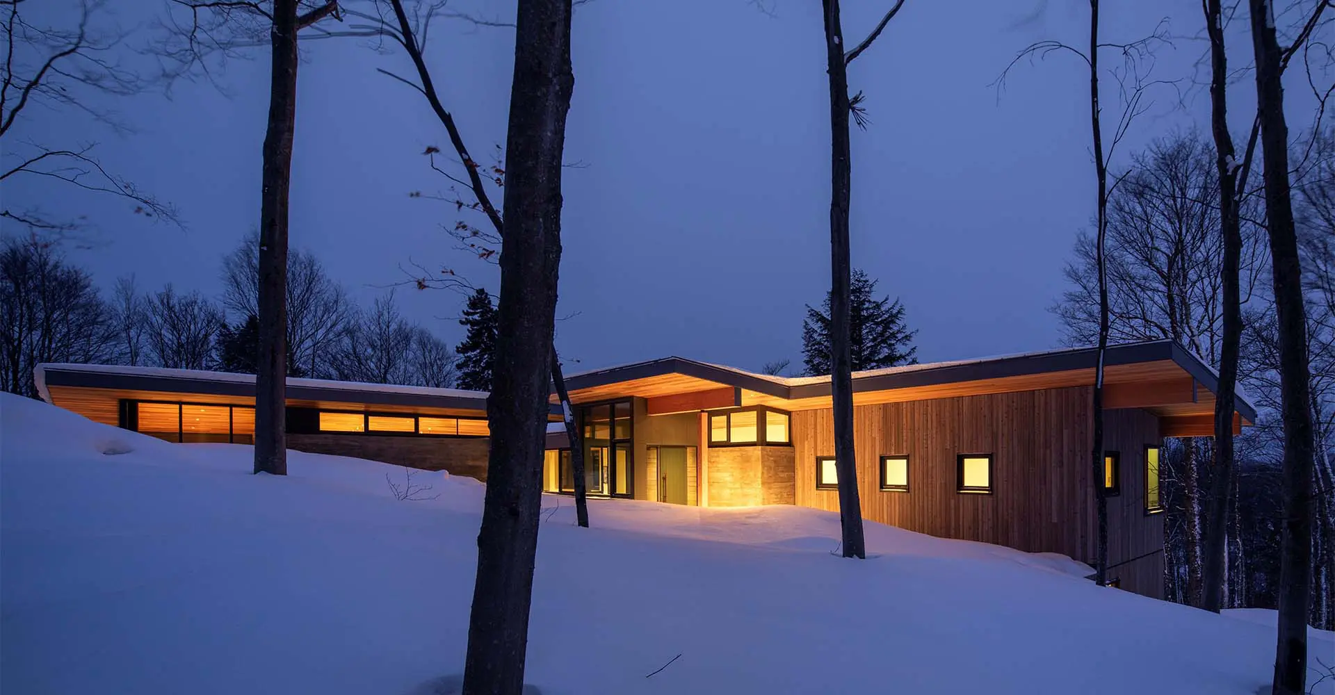 Ubicada en un denso bosque de arces, abetos, abedules, cicutas y hayas, la casa en forma de L está construida en la ladera. Su ubicación preserva los árboles maduros, a la vez que mantiene amplias vistas al lago Notre-Dame y a las montañas Laurentianas circundantes. Cada habitación se abre al bosque, creando un remanso de paz y contemplación integrado con su entorno.