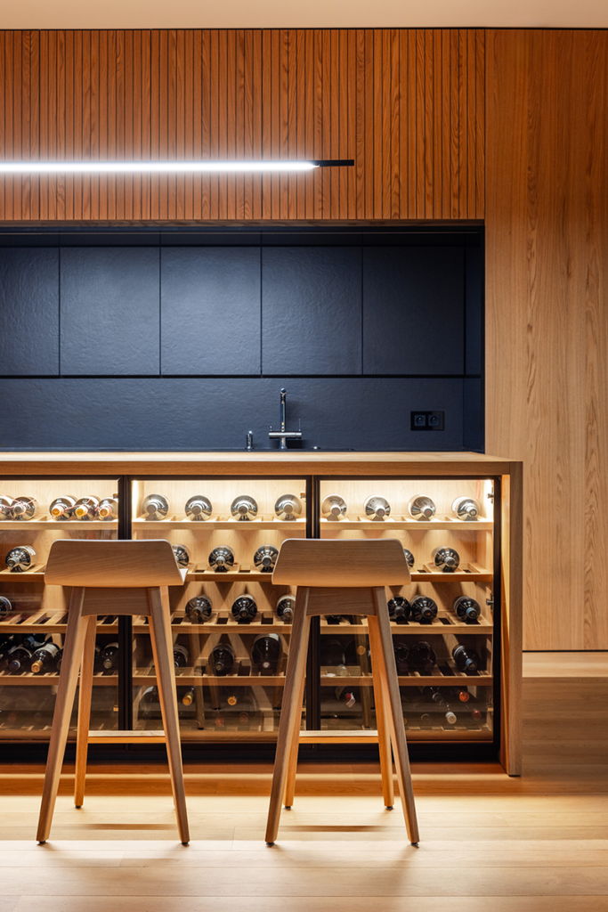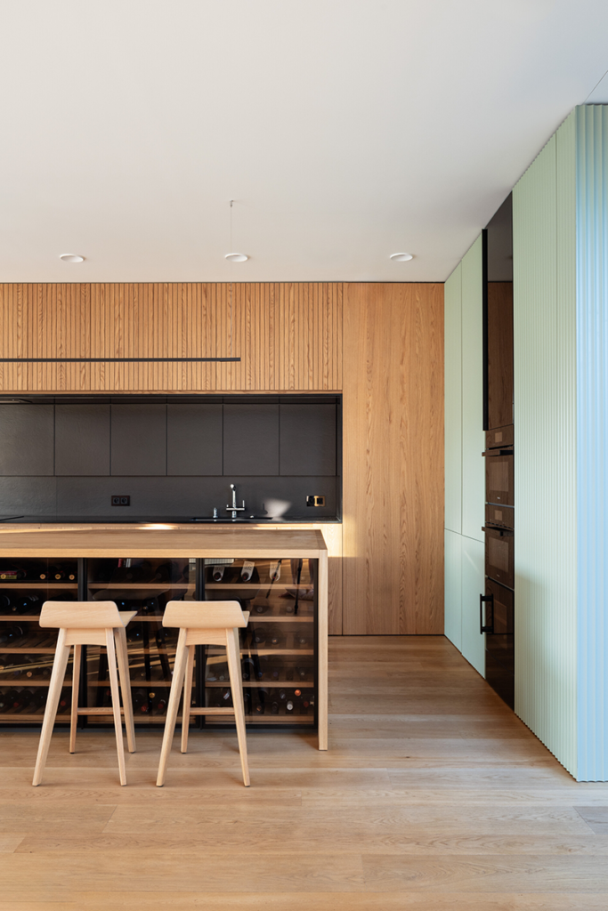 Asimismo, el espacio abierto se complementa con algunos muebles independientes, como la isla de cocina con bodega. Las puertas y los espacios de almacenamiento se integran perfectamente en el mobiliario empotrado. La prioridad, como en los proyectos anteriores de la firma de arquitectura, sigue siendo el uso de materiales en su forma natural.
