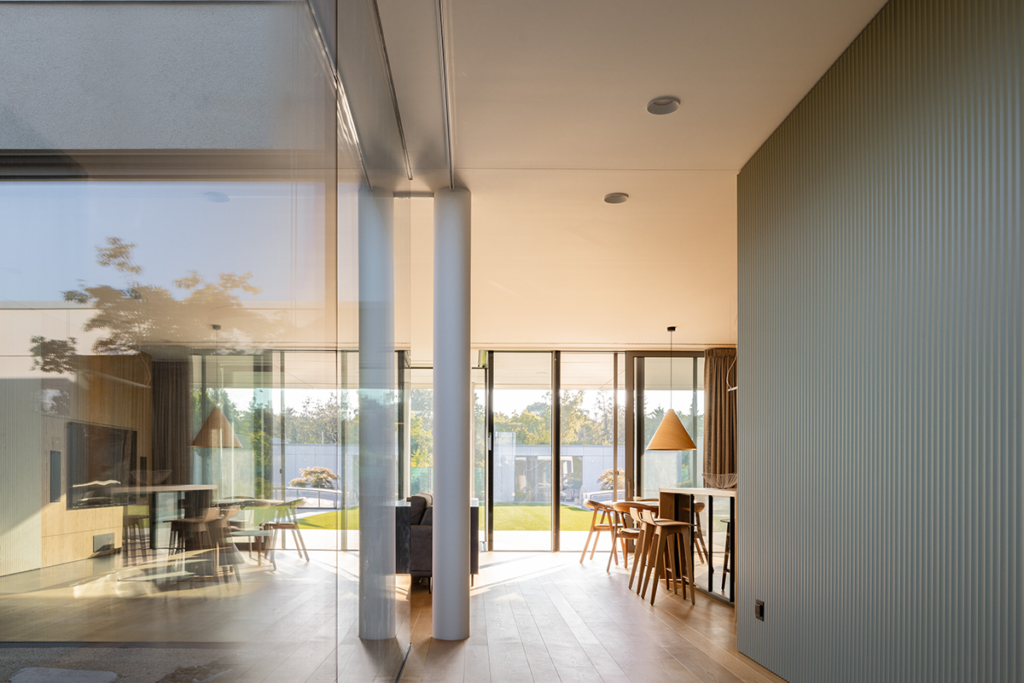 Al entrar al espacio abierto de la casa, se pasa por el ala de invitados con sus propias comodidades. La robusta materialidad del bloque técnico, adornado con un revestimiento de madera ranurada a la derecha, crea un sorprendente contraste con el atrio abierto.