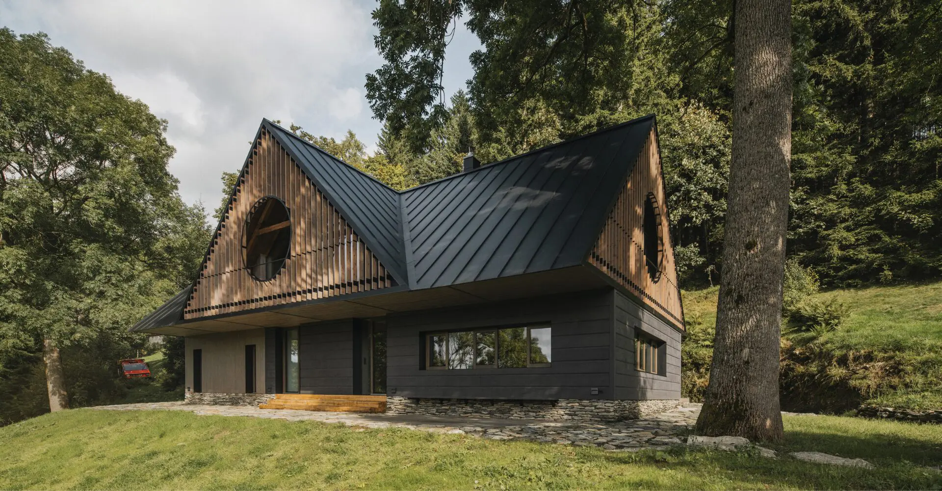 Los edificios en las montañas de Krkonoše se caracterizan por sus techos macizos y empinados que antaño permitían sobrevivir a los largos inviernos. Con buhardillas tipo pajar, un techo asimétrico sobre una estructura baja de troncos crea un porche protegido, frontones entablados, zócalos de piedra y una disposición tradicional tripartita. Fue precisamente esta casa la que se buscó devolver al lugar que le corresponde.