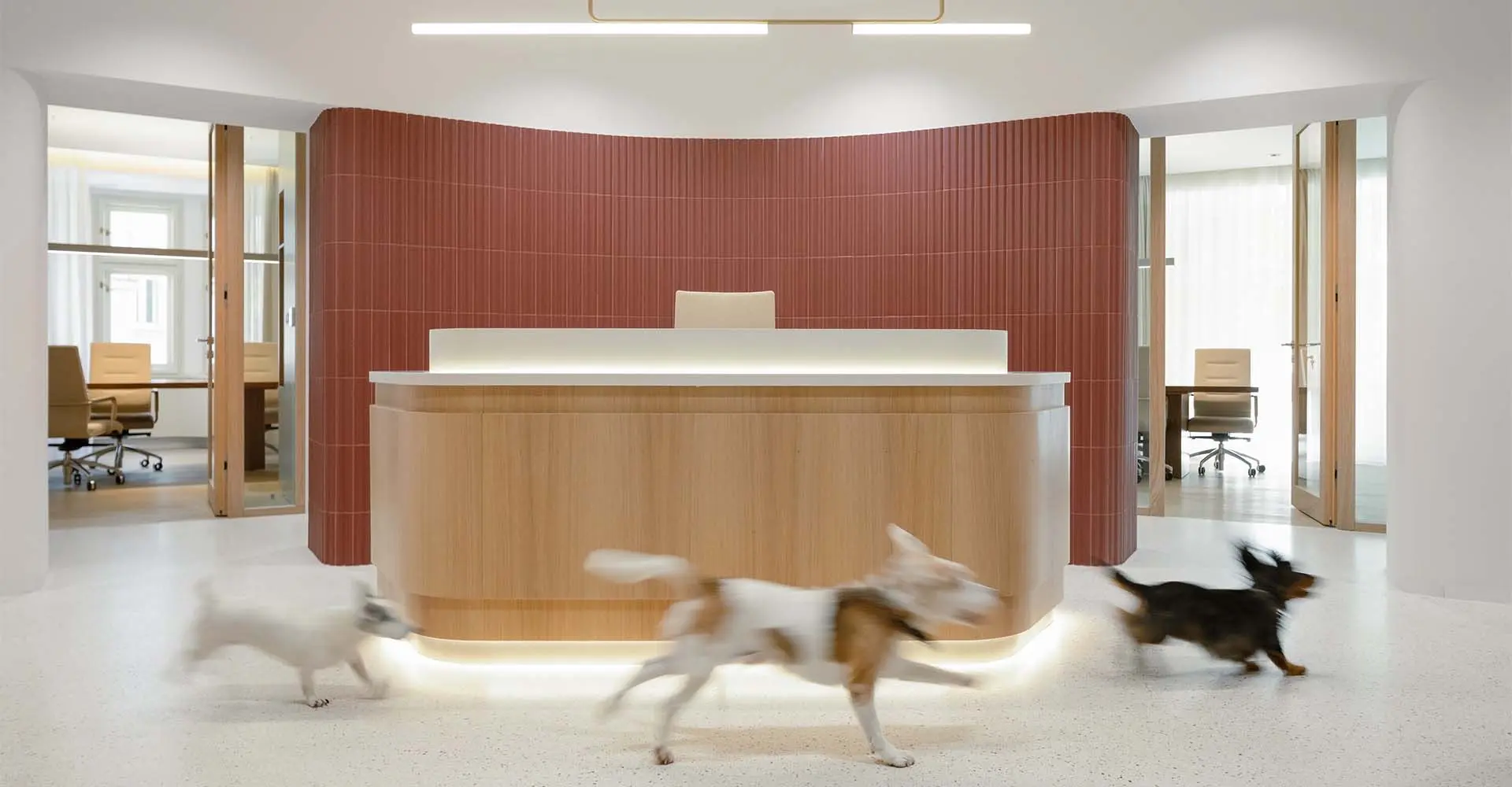 Estas superficies cerámicas se equilibran con el suelo, el mobiliario y los marcos de las ventanas de roble natural, que aportan calidez y una sensación de solidez al interior. Las mesas de reuniones de nogal hechas a medida introducen un sutil contraste táctil en las zonas comunes, reflejando un enfoque en la durabilidad y los detalles bien elaborados. La iluminación realza las formas curvas y las texturas de las superficies, guiando el movimiento por el espacio de forma discreta y silenciosa.