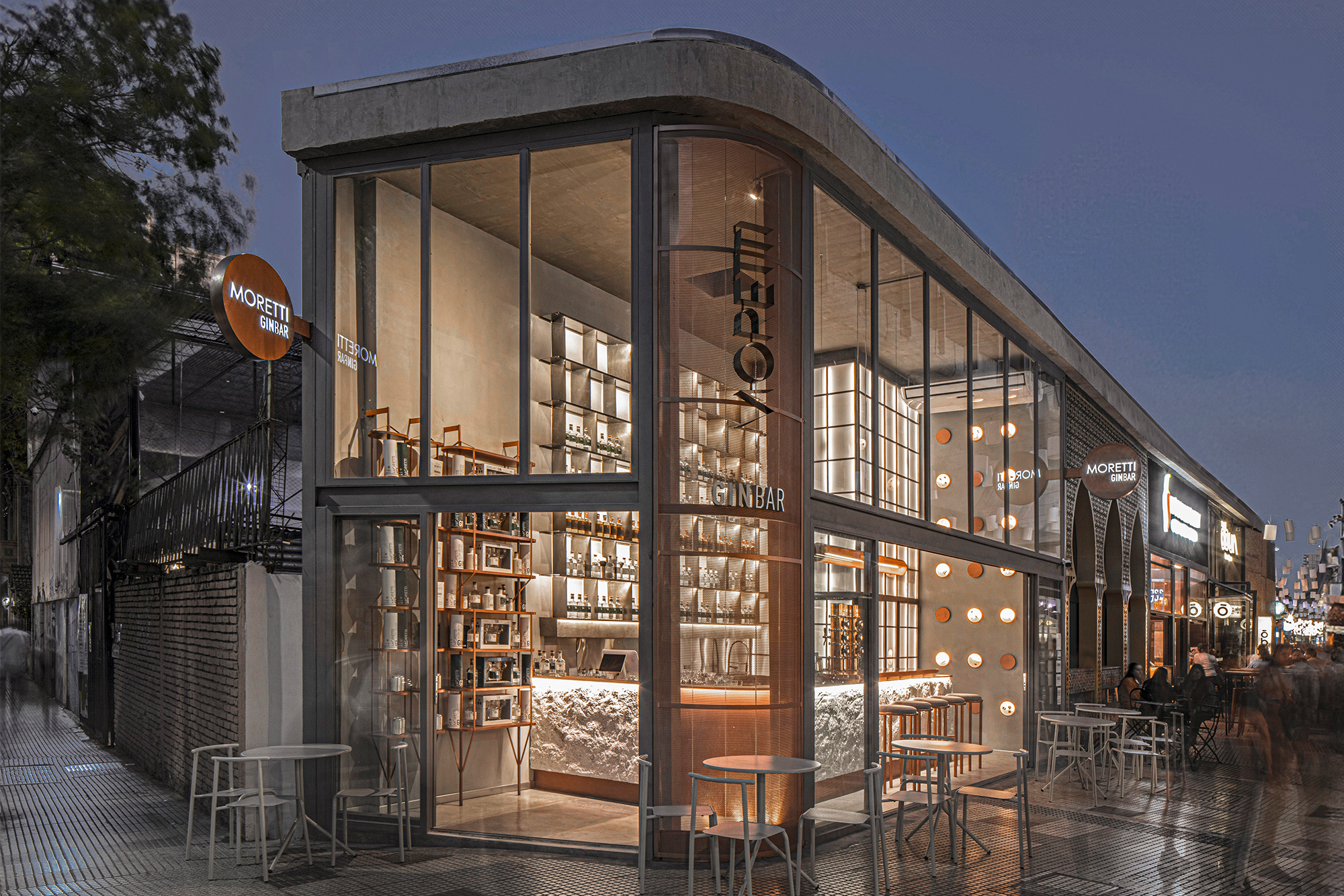 Para el diseño del primer local de la destilería Moretti —en Belgrano, Buenos Aires—, los arquitectos de la firma Grizzo Studio deseaban dar una identidad a esta empresa familiar especializada en la fabricación de ginebra de barril. “Tomamos como punto de partida los alambiques utilizados en el proceso de destilación de la ginebra, que tradicionalmente eran de cobre”, explican.