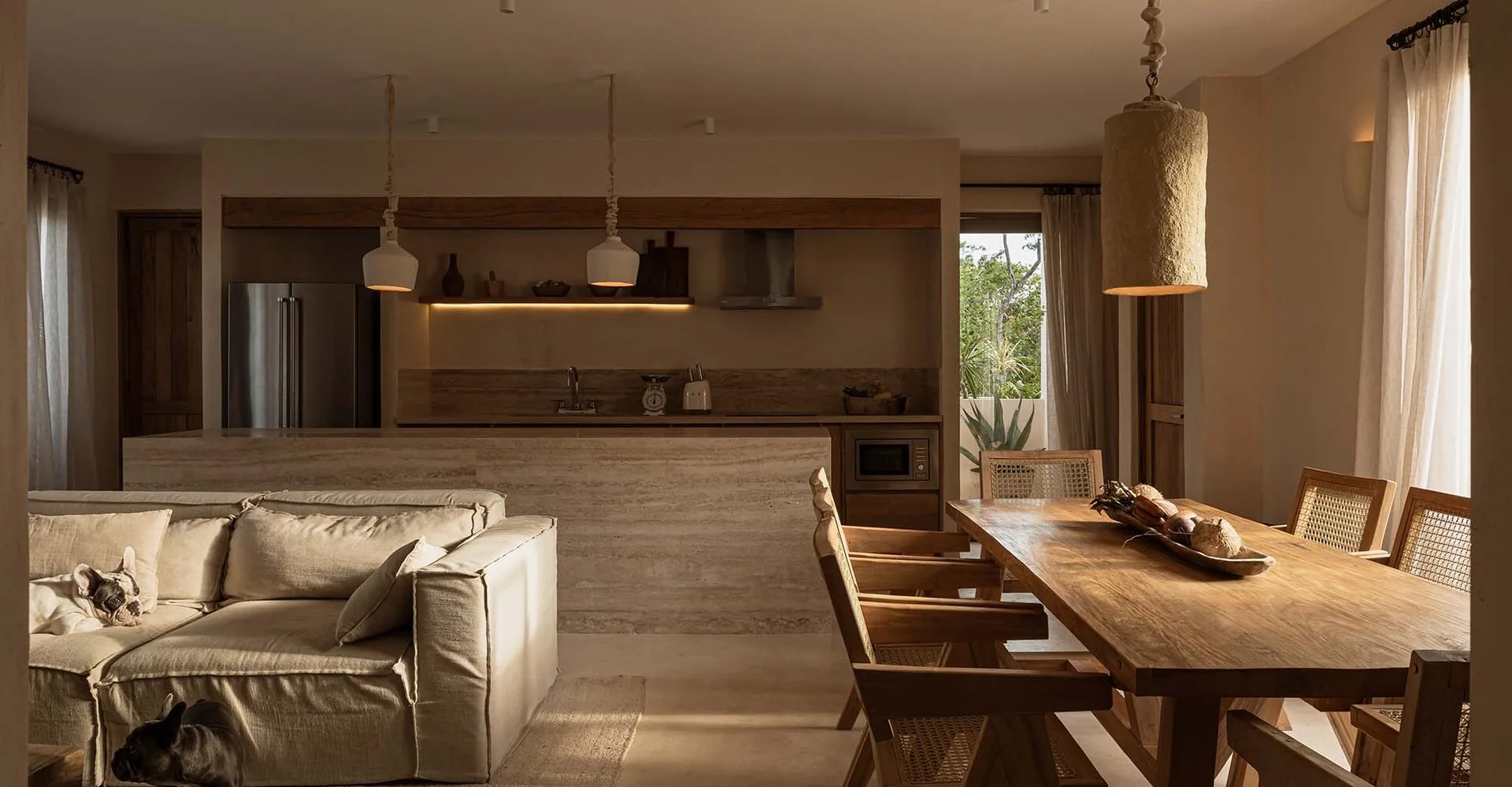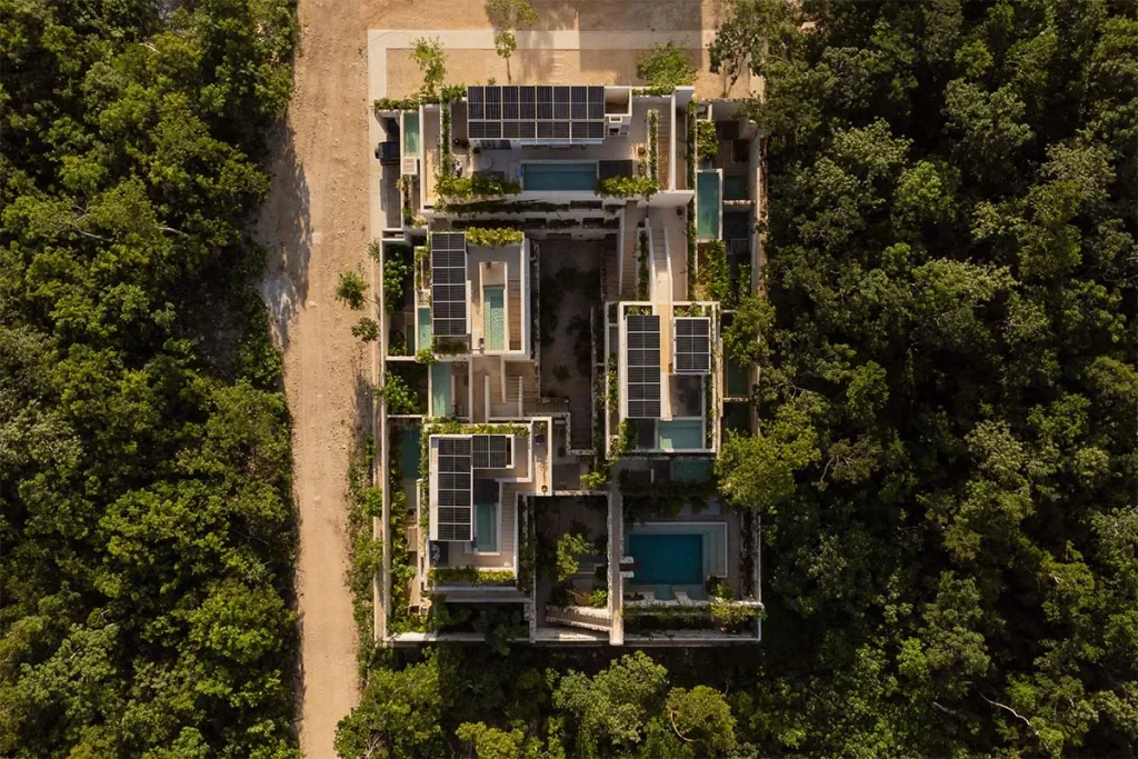 Cada nivel ofrece características distintivas: las unidades de la planta baja incluyen jardines y piscinas privadas, las unidades del primer piso cuentan con terrazas y jacuzzis y las unidades del segundo piso tienen terrazas y jardines en la azotea con vistas hacia las copas de los árboles. Por otro lado, la materialidad se basa en elementos locales. La base está construida con piedra regional, mientras que los muros están revestidos con Chukum, un revestimiento natural elaborado con procesos vegetales y arena que realza la luminosidad interior y reduce la huella de carbono del proyecto.