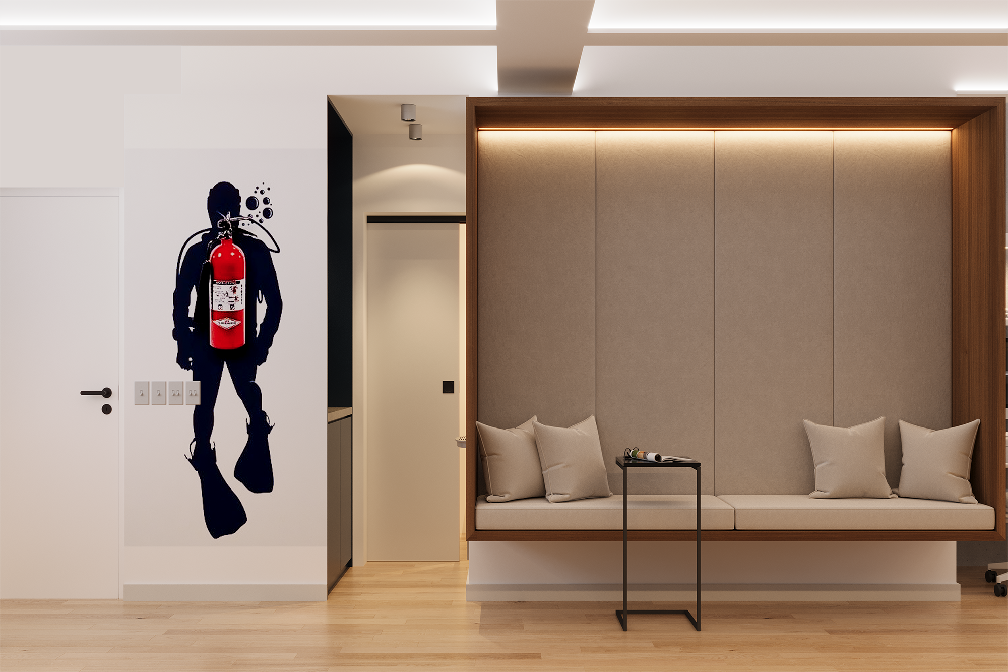 5. Para evitar las molestas cajas de vidrio donde se suelen disponer los extintores, la arquitecta encontró un recurso original: un grafiti que simula la figura de un buzo.