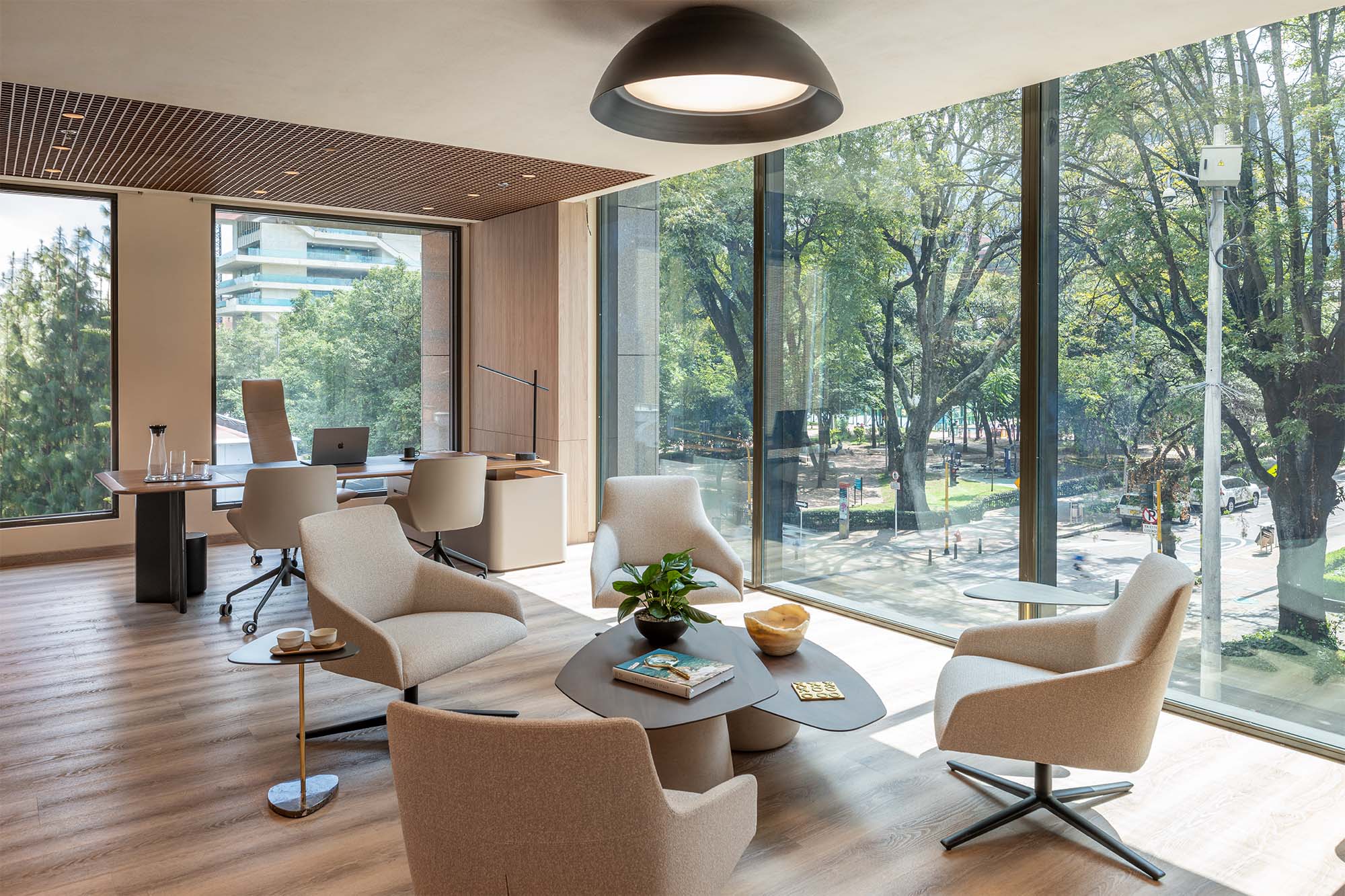 Con una abundante entrada de luz natural y amplias visuales sobre un parque colindante en el norte de Bogotá, en este proyecto tuvieron el “reto de trascender la rigidez tradicional de las oficinas corporativas para componer un entorno donde la productividad y la comodidad dialogan en armonía —explica Ángel—. Quisimos crear un espacio corporativo funcional que se sienta cálido, como un hogar, en vez de una oficina fría”.