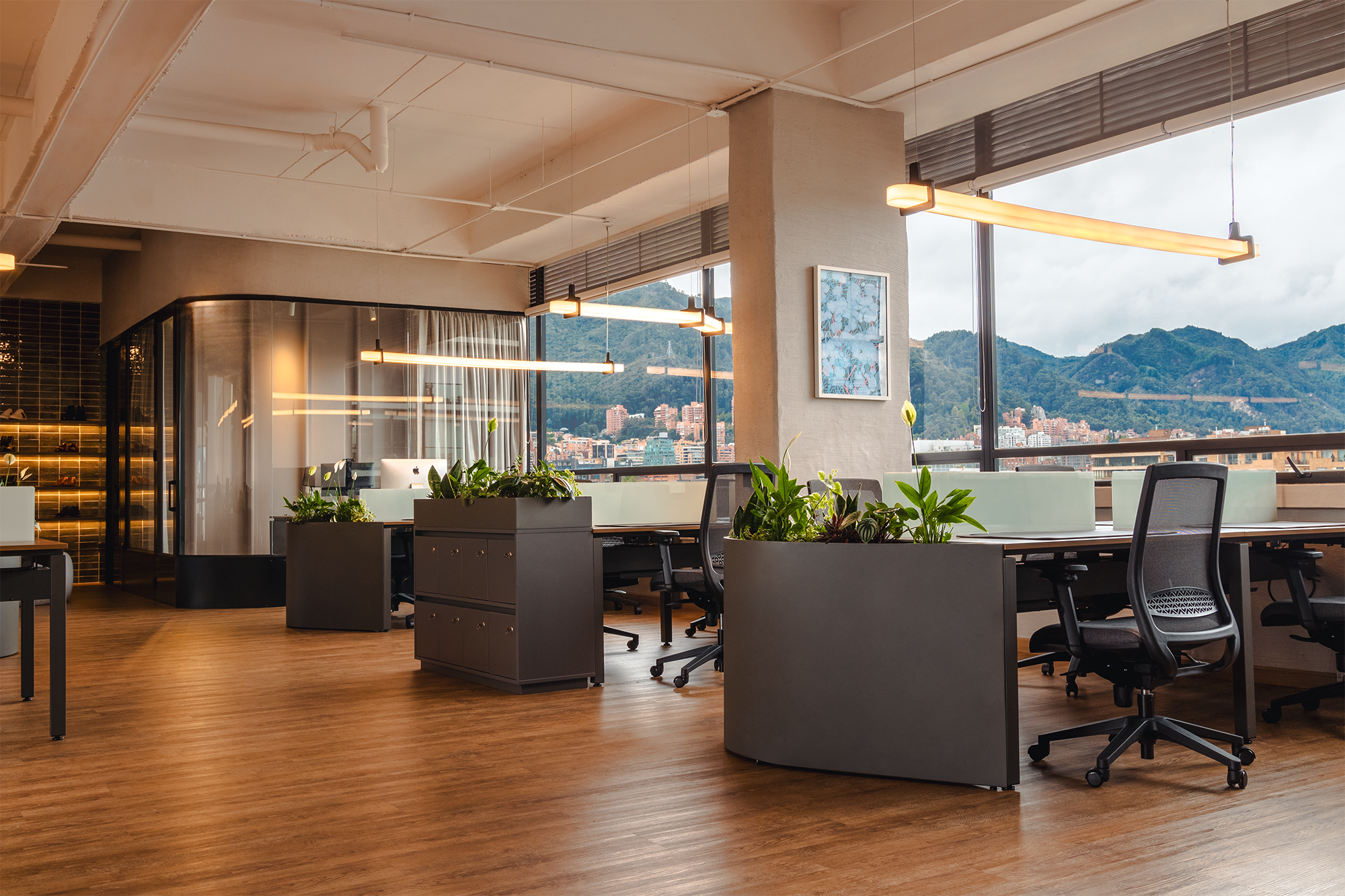 LAP se encargó, además, del desarrollo de todo el mobiliario utilizando referencias de AVS, una empresa con 38 años de experiencia en lo relacionado con el mobiliario doméstico, comercial y de oficinas, con la que trabajaron en equipo para customizar piezas de línea e integrales, así como materas curvas para animar cada estancia con vegetación. Adicionalmente, colaboraron en la fabricación de las bases metálicas de los puestos de gerencia y salas de juntas.